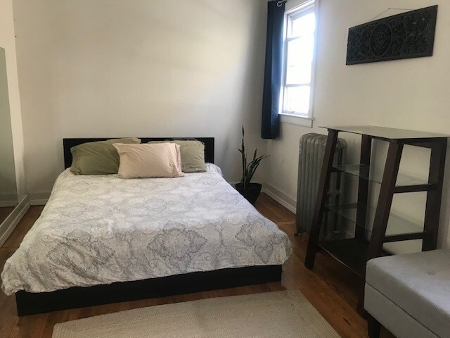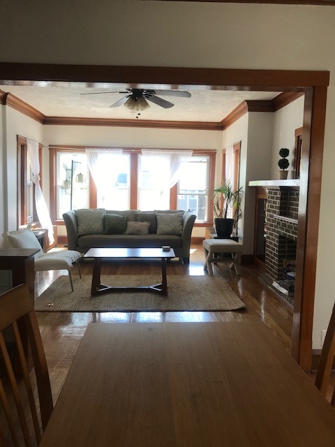 FULLY FURNISHED. Pet-friendly! Fabulous, bright and spacious apartment with gorgeous hardwood floors throughout. Lots of work areas for anyone working remotely. Kitchen is well-stocked with microwave, coffeemaker, coffee grinder, dishwasher, pots/pans, cutlery, glassware, dishes, utensils of all sorts. Lots of work-space to work remotely. Enclosed back porch. Beautiful, FURNISHED, spacious, sunny and bright 2nd floor apartment in hot Logan Square. All the charm of a vintage building plus modern updates. This cool apartment was used to shoot an episode of NBC's Chicago PD. - Gorgeous hardwood floors and original woodwork throughout in charming, vintage building. - Large living room with windows on 3 sides plus dining room - Big bedrooms: 18 x 9 and 12x 9 - Stunning built-ins, including fireplace and winebar - Ceiling fans - Dishwasher - Quiet 2 flat building - Enclosed porch (sunroom) - Parking on site - Vegetable and flower garden in backyard