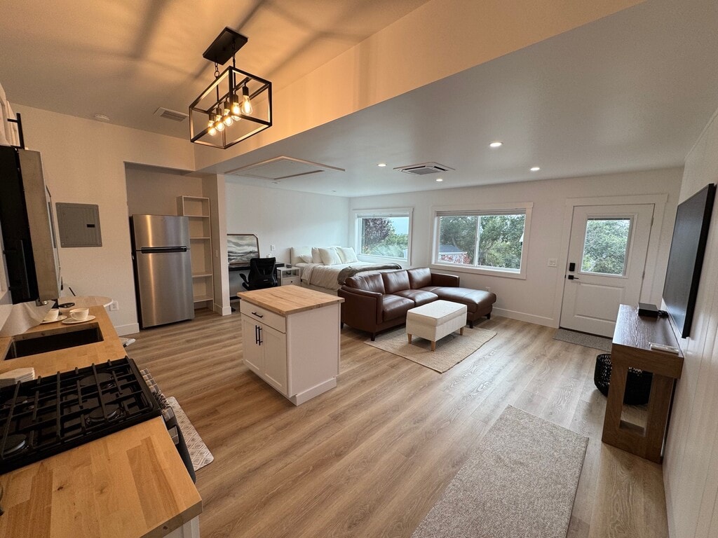 Welcome to our brand-new studio loft, located in a quiet gated address, offering an exceptional rental experience for travelers seeking a peaceful and luxurious retreat. This stunning property boasts a range of amenities that will ensure a comfortable and memorable stay. Travelers have access to private parking and a private entrance, providing both convenience and exclusivity. One of the highlights of this rental is the large private deck, where you can enjoy breathtaking sunrises every morning. Start your day by savoring a cup of coffee or a delicious breakfast while taking in the stunning views. This outdoor space is perfect for relaxation and unwinding. Inside, you'll find a thoughtfully designed living space. The stairway and loft area feature a black cable hand railing, adding a touch of modernity and style. The sleeping area is furnished with a comfortable queen bed, ensuring a restful night's sleep. The kitchen features soft-close cabinet doors, while the beautiful butcher block countertop adds a touch of warmth and character to the space. Adding to the kitchen's charm, a small custom wine rack with wine glasses invites you to unwind and indulge after a long day. For dining, the butcher block dining room table sets the stage for a cozy and intimate atmosphere. For those who need to work while staying in this studio loft, there is a small desk area available. The desk provides a dedicated space for you to set up your laptop and work comfortably. Take advantage of the high-speed internet connection and the peaceful ambiance of the loft to stay productive during your stay. Entertainment enthusiasts will appreciate the large 65-inch Samsung Frame TV, which showcases beautiful art when not in use. Enjoy your favorite shows, movies, or simply admire the curated artwork on this impressive screen. To create the perfect ambiance, this rental includes a 3-sided electric fireplace, providing warmth and coziness to the space. Relax on the comfortable leather couch and enjoy the flickering flames. The HVAC system includes a remote thermostat, allowing you to easily control the powerful air conditioning and heating combo. Stay comfortable in any weather and create the perfect atmosphere for your stay. The bathroom features a large ceiling with an abundance of natural light streaming through the skylight. It includes a double sink vanity and offers plenty of storage space for your belongings. The large mirror adds a touch of elegance, while the jacuzzi tub invites you to unwind and indulge in ultimate relaxation. Next to the tub, you'll find a small teak wood bench, providing a convenient spot to place your belongings or sit while enjoying your bath. The loft also includes a new stackable washer dryer combo, complete with an expandable clothes rack for items that need to air dry. The walk-in closet includes plenty of storage, allowing you to keep your belongings organized and easily accessible. The upscale neighborhood surrounding this property offers stunning landscape scenery, perfect for quiet neighborhood walks and exercise. Immerse yourself in the beauty of the surroundings and enjoy the tranquility of the area. Additionally, this rental is conveniently located near major hospitals, making it an ideal choice for medical professionals or those seeking easy access to healthcare facilities. Furthermore, the property is just a 5-minute drive from downtown Arroyo Grande, where you'll find a charming array of shops, restaurants, and all while being surrounded by central coast wine country.