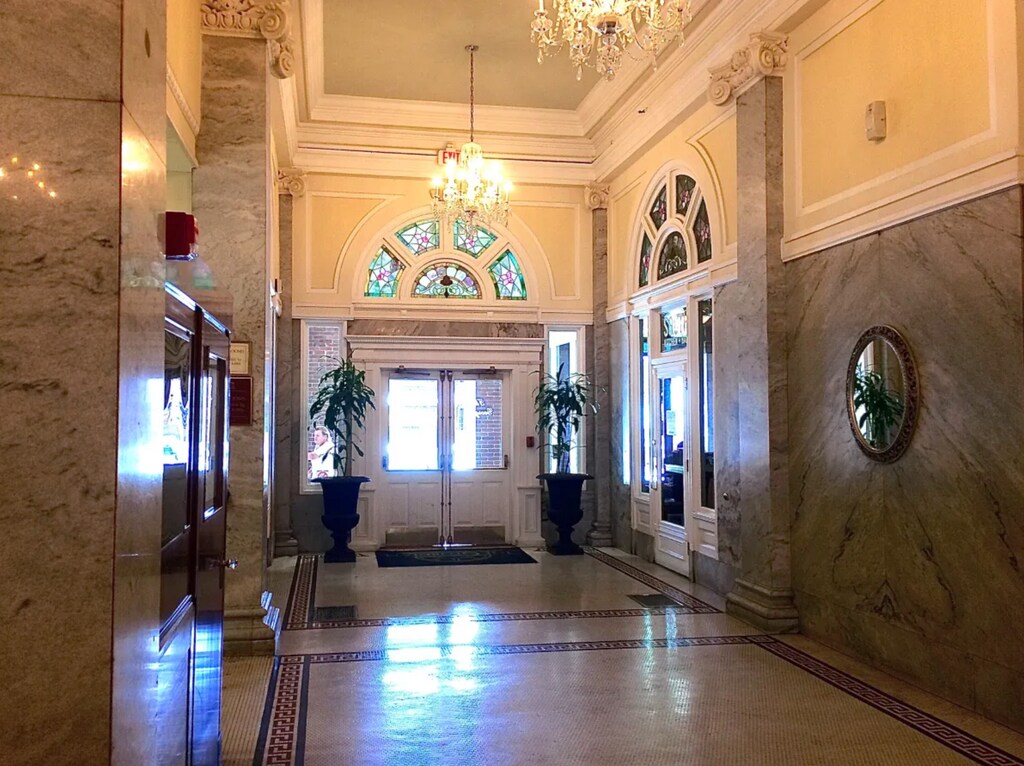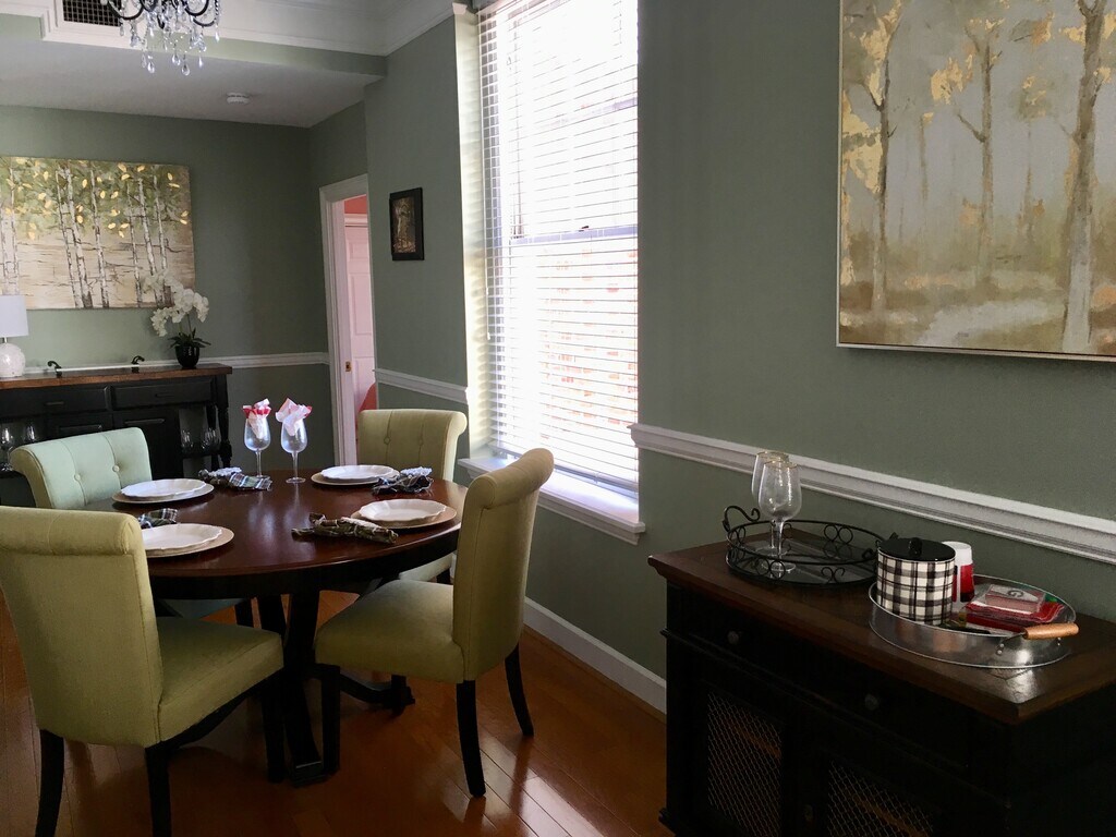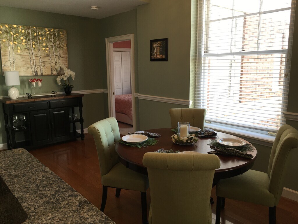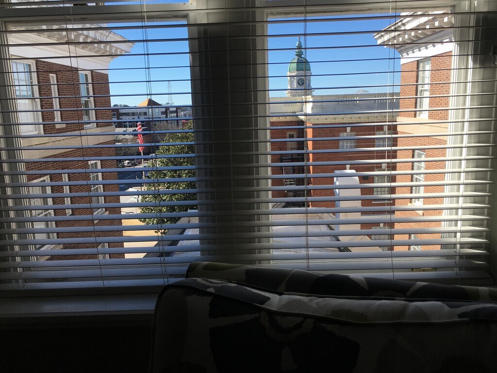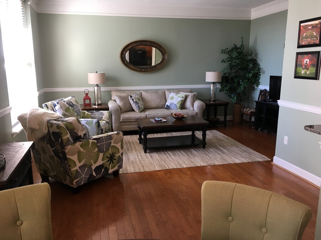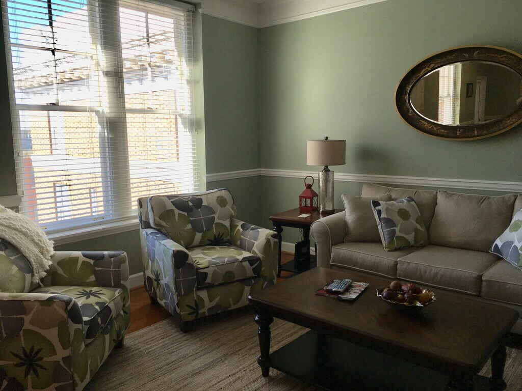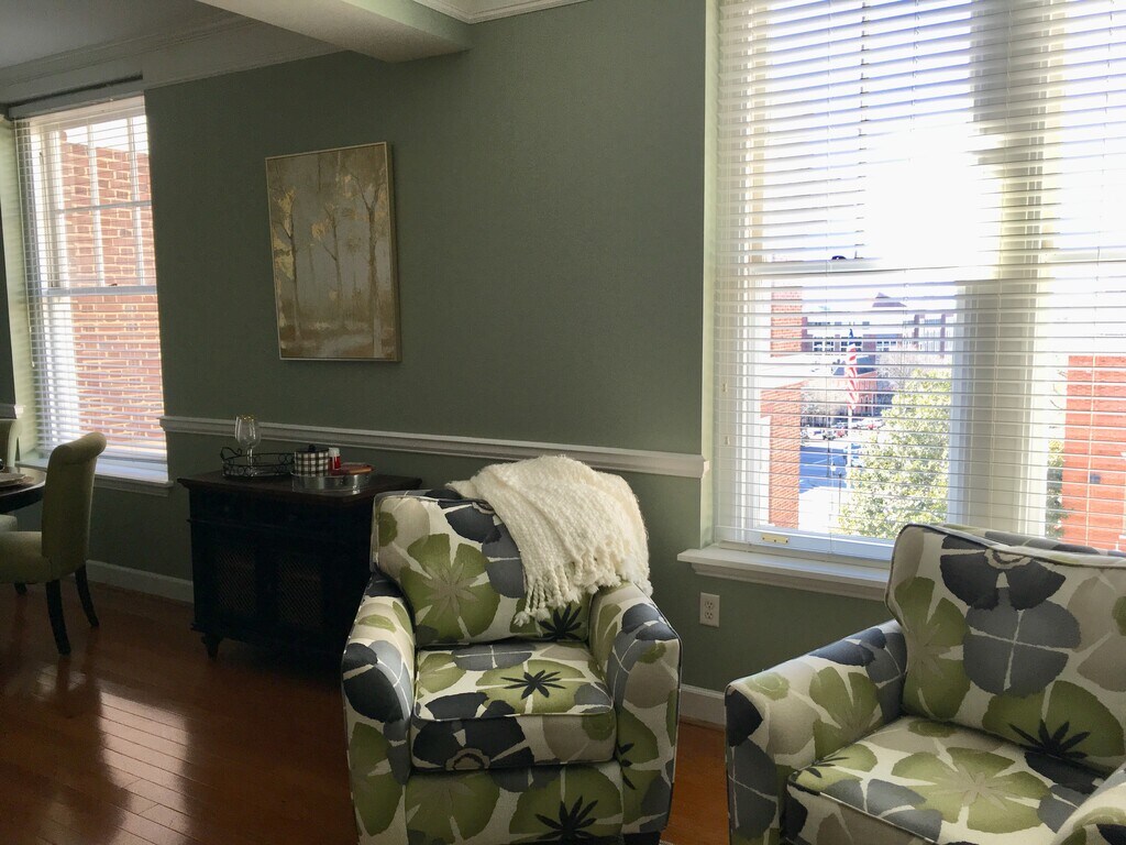 An incredible 875 sq ft furnished one bedroom/one bathroom condo with large open dining and living room and fold out sofa is located on top (fifth) floor of the Georgian. It includes full-service accommodations, including exquisite Five Star Egyptian cotton sheets and linens, WiFi, large screen TV, fully furnished living room, dining room table for four, washer, and dryer, and full kitchen with granite countertops, coffee maker, plate and cookware. Hardwood floors run throughout the main living and dining room of this penthouse suite, with a carpeted bedroom and tiled bath. The entire Condo has 9 foot ceilings with elaborate crown molding, neo-classical architecture and large “period” windows offering sweeping views of the City Hall Clock Tower and Downtown. Our Condo also includes a covered, gated, complimentary parking space at the Courthouse next door. This is truly one of Athens’ premier residences. The gorgeous, historic Georgian (built in 1908 as the Georgian Hotel) is in the Heart of Downtown Athens and boasts one of the town's premier ballrooms, a lush Lobby with period English stained-glass windows, and it’s own Restaurant and Bar- the renowned South Kitchen. You are only 2 blocks from The Arches, (the historic gateway entrance to UGA’s North Campus) and a short walk to the Stadium. Rent includes private mailbox, water, garbage pick up, private covered parking, and full use of our lobby for your guests. Electricity and cable/wifi are not included and should be paid individually by tenants.