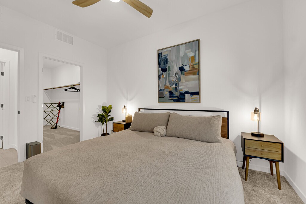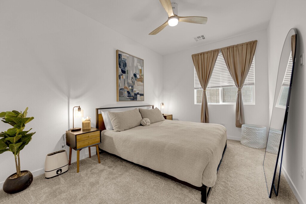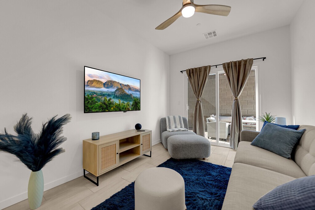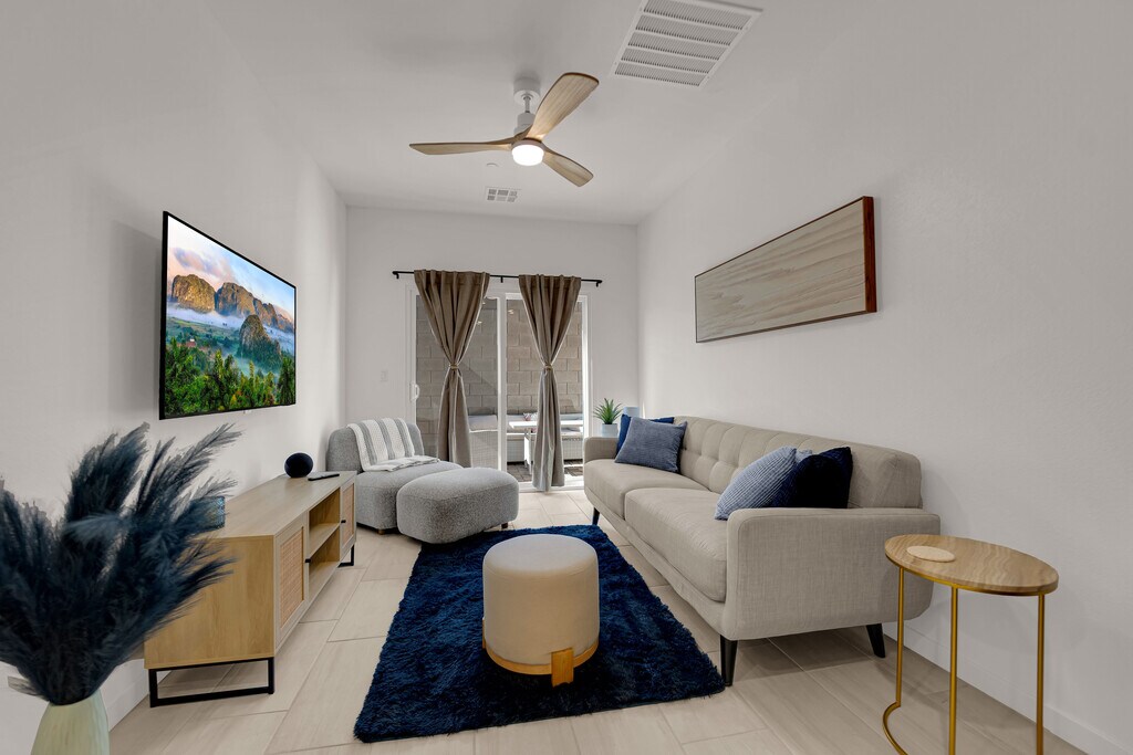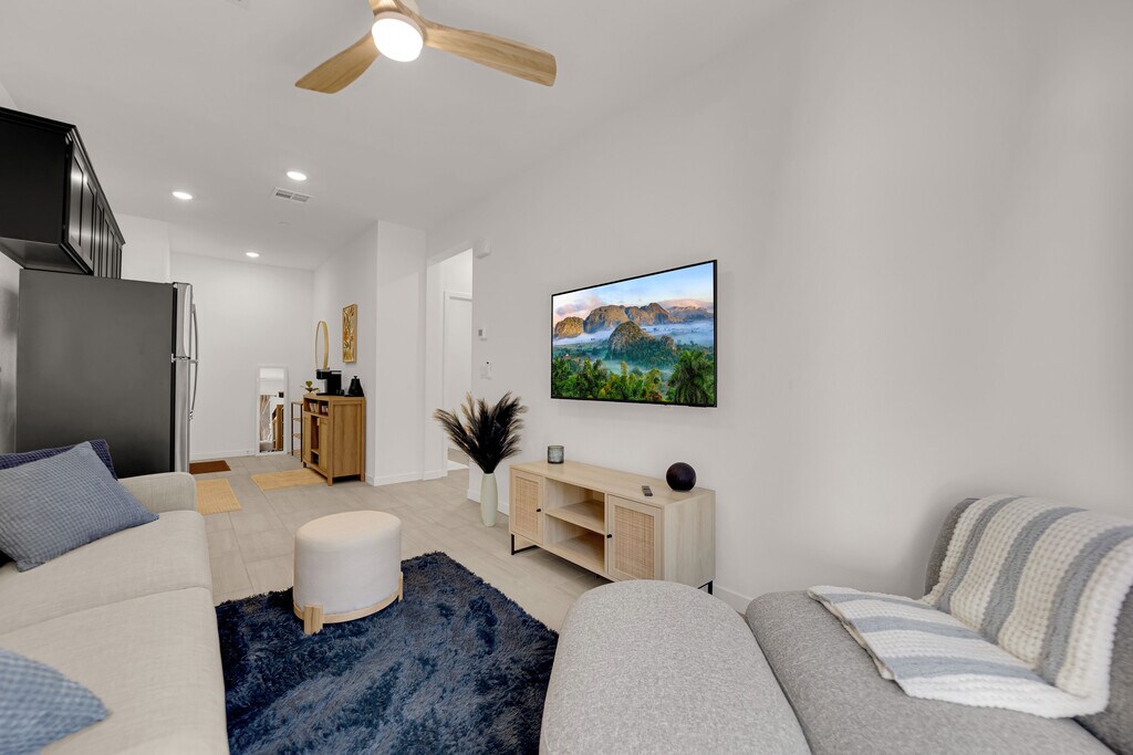 Feel right at home in this thoughtfully designed, newly built first-floor unit in a two-story townhome. This spacious 1-bedroom, 1-bathroom residence features an open floor plan with a bright, airy living area flooded with natural light, creating a warm and inviting atmosphere. The well-equipped kitchenette includes modern appliances such as a two-burner induction cooktop, convection microwave, toaster oven, Keurig coffee maker, and electric kettle—everything you need to prepare your favorite meals. A 50" Samsung Smart TV is mounted in the living room for your entertainment, with high-speed Wi-Fi and an Ethernet port to keep you reliably connected for streaming or working from home. The spacious bedroom features a king-sized bed and soft carpet for added comfort. A generous walk-in closet provides ample storage and conveniently houses the washer and dryer unit. Ceramic tile flooring throughout the rest of the unit helps keep the space cool during the summer months, while ceiling fans maintain an ideal temperature year-round. Step outside from the living room to your private backyard, perfect for unwinding after a long day. The unit has a fully separate entrance, with only a shared walkway and access to a shared garage that includes an EV charging outlet. Conveniently located just minutes from the highway, this home offers easy commuting. Utilities are included for a hassle-free stay.