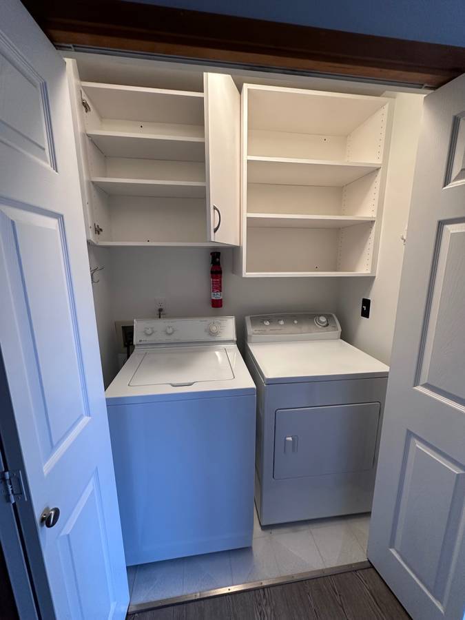 Charming second-floor 2-bedroom, 1-bath unit in a well-maintained duplex offering comfort, privacy in one of Bend's most desirable locations. This 750 sq ft home will be freshly painted and features a brand-new Trex private covered deck, perfect for relaxing or entertaining year-round. The apartment includes in-unit washer and dryer, quiet-core laminate flooring, mini split for heat/AC, and a well-equipped kitchen with dishwasher, microwave, and disposal. Each bedroom features a large double sliding-door closet for ample storage. Additional storage includes a hall closet, built-in storage cabinet, and shelving above the washer and dryer, along with abundant kitchen cabinetry. The kitchen also offers generous counter space with room for 2-3 counter-height chairs, creating a convenient casual dining or gathering area. Off street parking is available tandem in the driveway or in the private oversized garage, offering flexible and secure parking options. The private garage has plenty of room for a car and/or all of your outdoor gear to enjoy the PNW lifestyle. Located just two blocks from Miller's Landing and within easy walking distance to downtown Bend, the Old Mill District, and Galveston, you'll enjoy easy access to restaurants, breweries, river trails, and the outdoor lifestyle that makes Bend a year-round destination. Water, sewer, garbage, recycling, and snow removal are included in monthly rent. Seeking quiet, considerate tenants who will appreciate and care for this highly desirable rental. No Smoking. Tenant pays for power bill and wifi and anything else needed.