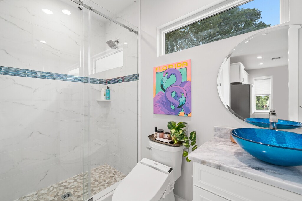 This new, luxury one bedroom, one bathroom apartment is located just north of downtown in Historic Old Northeast. This garage apartment with of an address of 249 1/2 8th Avenue N is open and airy, with lots of natural light and located on a quiet alley with its own access. Top of the line appliances, 9 ft ceilings, luxury bedding, bidet, and high speed internet are only a few of the amenities that make this apartment unique. The apartment is fully furnished, including pots, pans, iron, coffee/tea making appliances etc It also comes with its own parking pad adjacent to the entrance door. Electricity, water. sewer, trash and internet included in price. High end luxury all the way with magnificent attention to detail! $2700 a month with a 1 year lease. Available May 1st. Perfect for a business professional. Non Smoking unit. A ten minute walk to the beach and the beautiful downtown area with restaurants and shops along Beach Dr. and Central Ave. as well as minutes from Florida's beautiful beaches. Tampa Bay and Busch Gardens are just across the Howard Franklin Bridge. The neighborhood has so much to offer from Black Crow Coffee to Old Northeast Tavern, Northeast Pizza, the Palladium and the brand new Arts and Crafts Museum. Saint Petersburg is a gold mine of things to do with museums, festivals and music venues. The Colosseum, Vinoy, Museum of Fine Arts, Salvatore Dali Museum, Al Lang Stadium, and the St. Petersburg Pier are all close by and a pleasant walk away. You are 20 minutes from Tampa Airport and 20 minutes from the world famous pristine white sands of our Gulf Beaches.