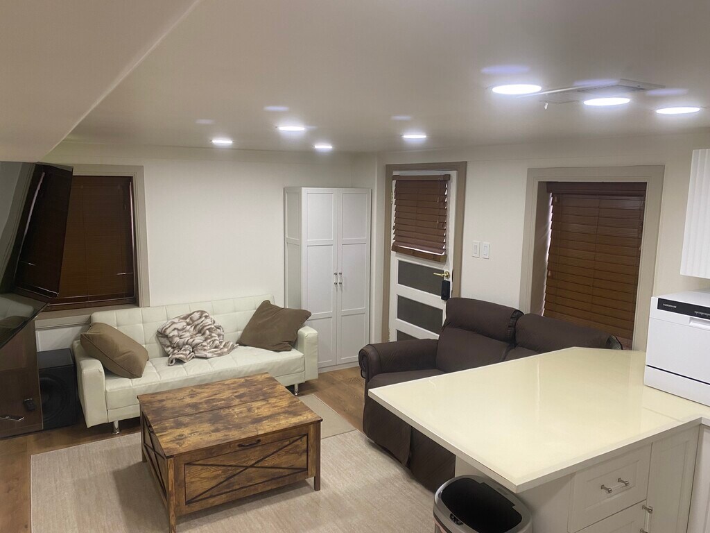 Fully furnished and remodeled stylish space located a mile from Canyon Trails, Station Park, Lagoon, and I-15 access. All high end furnishings and appliances designed for a luxurious tiny home experience. Heated steam shower bathroom with motion activated illuminating vanity countertop. Supplemental heating in each room, Multi-burner grill and fire pit outside, dual wall-away recliners, Washer and dryer, Glass Samsung fridge/freezer, 11 in 1 air fryer convection oven, electric skillet, induction cooktop, countertop dishwasher, water filtration system, garbage disposal, AC powered trashcan, Cordless Dyson vacuum, 12" gel memory foam mattress and excellent air filtration. 4k Apple TV units for 80 and 50 inch 4k TVs. Access to Apple movie library, Apple TV+, ESPN+, Prime Video, Hulu, Netflix, Paramount Plus, and HBO max. Wi-Fi lighting and appliance control. High-speed wireless internet. Large locked storage space adjacent to the unit on far end. Access to billiards/ping pong room with tournament quality pool table through back door in storage area. Dishes, glassware, and silverware provided. Queen bed sheets, towels and closet hangers not included. Furnishings can be rearranged or swapped upon request.