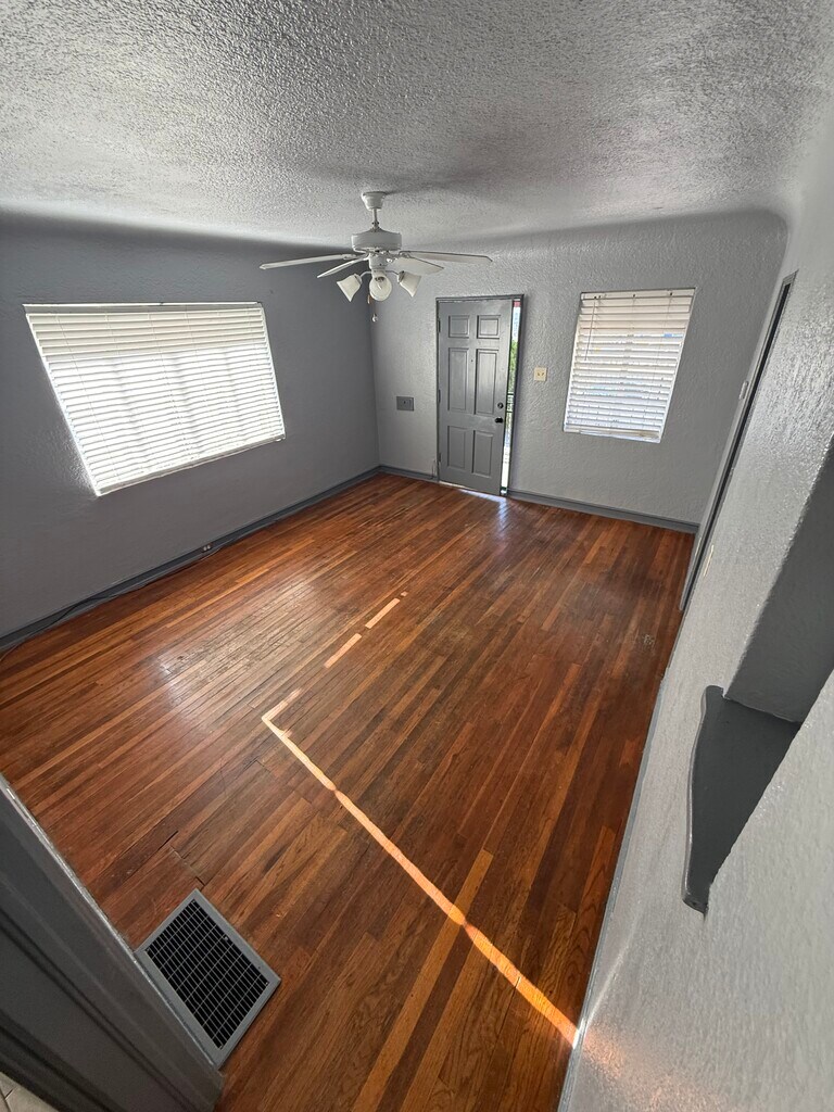 Front unit in multi-unit property. Best view! Unit freshly painted with light gray walls + dark gray trim. Refrigerated air. Owner pays water. Newly tiled bedrooms. Wooden floors in living room and hallway. Tiled kitchen floor.