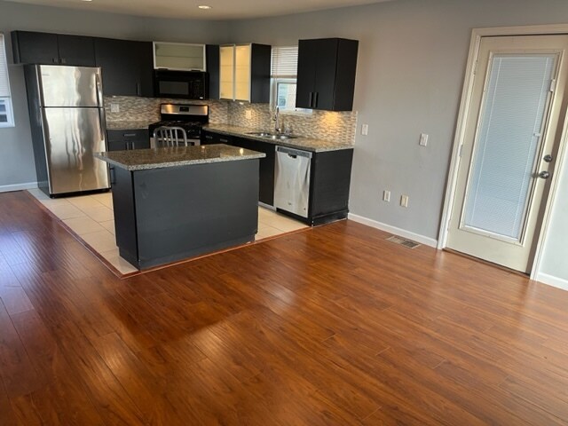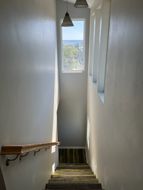 2 BR 1 BA modern apartment this is the two top floors of a three story duplex/house. Off street parking for two vehicles. Open concept Living room and kitchen are on second floor, ample natural light. Granite countertops. Enjoy a large private patio/deck with pergola, accessed through living room door. Vinyl flooring in living room and bedrooms. Full bathroom on third floor with bathtub/shower. Great views to the west of harbor. Convenient location near Little Italy, downtown and airport areas. Central heating and a/c. Tenant pays half of utility per month to owner for SDGE. Note that there is a flight of stairs you must go up to access entrance to the living room and kitchen that are on the second floor. Then there is another flight of stairs to get to bedrooms and bathroom on the third floor. (There is a separate apartment on the ground floor.) Includes refrigerator, oven/stove, microwave, and dishwasher, abundant cabinet storage, and a breakfast bar overlooking the main living area. Both bedrooms are located upstairs and offer large windows that bring in warm, natural light. Additional conveniences include an in-unit washer and dryer, central heat/AC, and parking for 2 cars. An outdoor large metal storage shed is on the patio. Just minutes from Balboa Park, downtown San Diego, major freeways, and the waterfront . Pets OK with approval