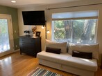 We are happy to share this unique enclave of natural beauty and sweeping views within the cosmopolitan Bay Area. Enjoy your own outdoor living space surrounded by greenery with views of the San Francisco Bay in the distance. Privacy and peace. The studio apartment has its own off-street parking space and private entry. It is tastefully furnished with a queen bed, lounge chair, big screen smart TV with Apple TV, comfy sofa, cute kitchenette, large closet with storage space, full-size bathroom, and fast 1 gigabit WiFi. French doors and a large window provide green-space views and lots of light. The ideal renter is one adult who appreciates the quiet and safety of a semi-rural setting and can manage with a compact kitchenette. It's move-in ready.