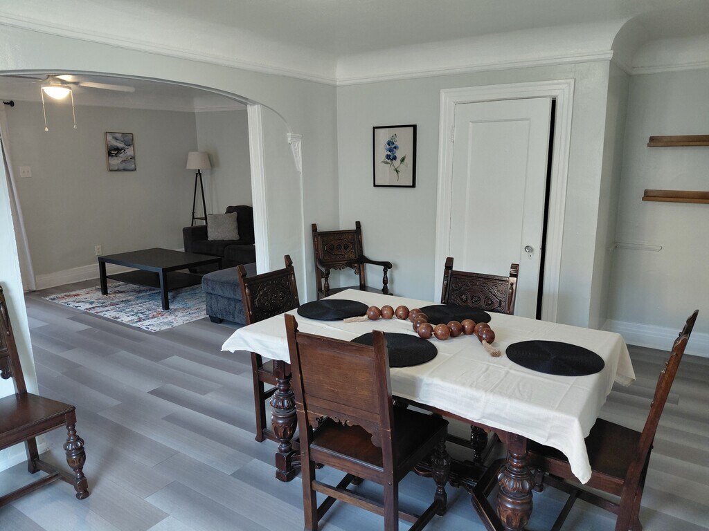 Welcome to your West Adams home away from home! Check out this spacious and fully furnished 2-bedroom retreat. Enjoy the comfort of this 1,100 sq. ft. single-story home in a charming duplex. This 2-bedroom, 1-bath unit blends modern touches with timeless character and comes fully furnished for a hassle-free stay. Inside, you'll find a large, fully equipped kitchen and dining room, generous walk-in closets, and the convenience of in-unit laundry. Relax in the cozy living space with a big-screen TV, or enjoy fresh air on your private front patio with access to a shared, gated yard. Amenities include high-speed WiFi, linens, towels, starter cleaning supplies, a Keurig coffee maker, microwave, toaster, and more - everything you need to feel right at home although you are away. This home offers the perfect balance of comfort and practicality. Utility Note: Utilities included up to $200.00/month. Pet Note: We allow 1 well behaved pet. A pet deposit of $500 and pet rent is $50/month will be required. Accessibility Note: To access the unit you must go up 4 steps located on the outdoor porch which may not be accessible for people who use a wheelchair. To access the bedrooms and bath you must go down a hallway. Other Note: The other unit is occupied and the tenants have a small dog. Please message us for all inquires and questions about this property.