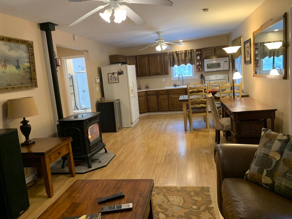 This stand alone, fully furnished apartment is a 2nd floor walk-up built above a large 2-car garage with its own private enterance right off the designated parking area for 2 cars. The apartment is light-filled, with windows on all sides affording tranquil views into the pine trees overlooking the surrounding property. The main house and apartment are located on a beautiful 2.5 acre manicured parcel. Off the enterance is a private deck for relaxation and barbequing. Interior ammenities includes a washer and dryer, walk-in closet, and a pellet stove. Cable, sewer, water, and electric ($200 allowance) are also all included (Propane heat is not included in rent). Restaurants and shopping are minutes away and offers close proximity to Route 6, Taconic, 684, and train stations to NYC.