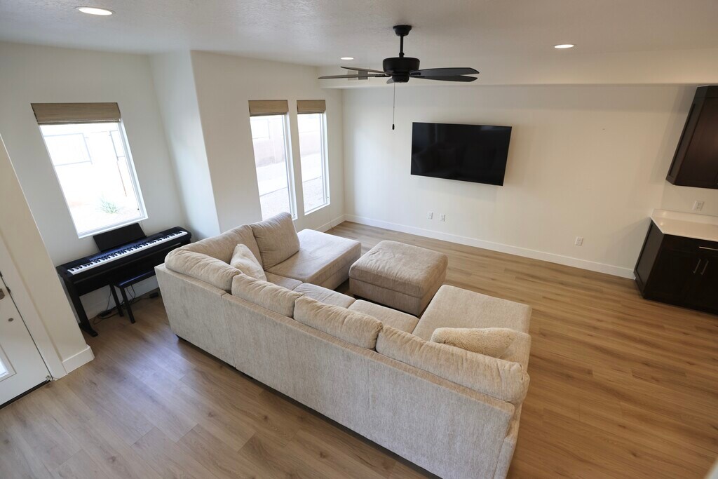 PROMOTION: 50% off first month’s rent with lease signed by 10/01/2025. Bright, spacious 3-bedroom, 2.5-bathroom end-unit townhome featuring approximately 1,505 square feet of contemporary comfort. Move-in ready home with an open-concept main level and sleek kitchen equipped with stainless steel appliances (refrigerator, stove, and dishwasher), 65-inch TV, plus washer and brand-new dryer. Prime Location - Everything at Your Doorstep: Located in the heart of St. George's most convenient neighborhood, you're just minutes from daily essentials and local attractions: • Lin's Grocery Store - practically next door (2-minute drive) • Walking distance to the beautiful Red Cliffs Utah Temple • Quick access to Costco, Smith's, VASA Fitness, and premium shopping • Top-rated schools nearby Unbeatable Community Amenities: • Relaxing lazy river swimming pool and rejuvenating hot tub • Pickleball courts for active lifestyle enthusiasts • Cozy fire pits perfect for evening gatherings • BBQ grills for outdoor entertaining • Well-maintained playground and beautifully landscaped grounds Lightning-Fast Connectivity & TV: • Fiber internet with blazing 1GB download AND 1GB upload speeds - perfect for remote work, streaming, and gaming • Comes with a 65 inch TV in the living room. Lease Details: • Rent: $1,950/month (12-month lease preferred) • Security Deposit: $1,250 • Utilities: Tenant responsibility (approximately $200/month) • Parking: Private attached 2-car garage (fits two full-size vehicles) • Available: Immediate occupancy (September move-in available) • Bonus: Bar stools available for kitchen counter. (4 total) • Professional, non-smoking household preferred • STRICTLY NO PETS Pictures feature furniture. But the townhome comes unfurnished. Serious inquiries only please.