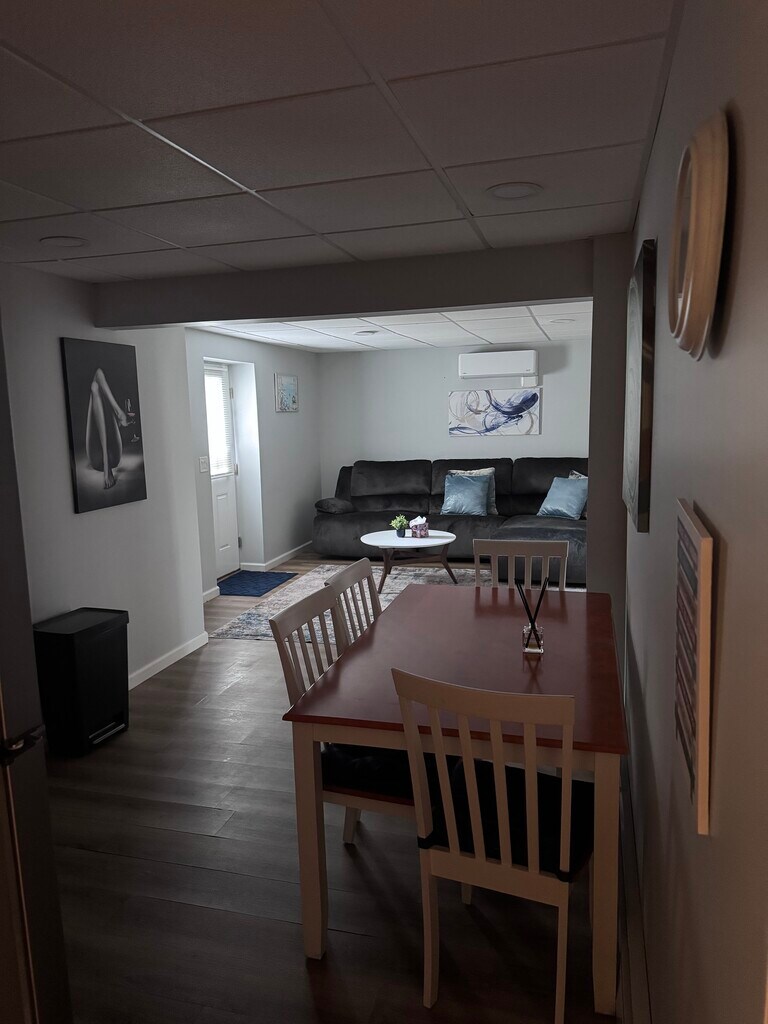 Newly refurbished basement apartment in single family home. Double bedroom with built in closets. Private entrance. Large living room with storage closet. Electric fire place. Private yard and parking area. Split AC and heat separately controlled. All utlilities included (oil, electric and wifi). Apartment DOES NOT have a washer/dryer. Apartment is furnished. Close to Riverhead shops and restaurants, hospitals and Tanger Outlets. Quiet neighborhood with access to the north fork and vineyards. Minimum of 6 months commitment then month to month. Additional rent may apply for 2 people.