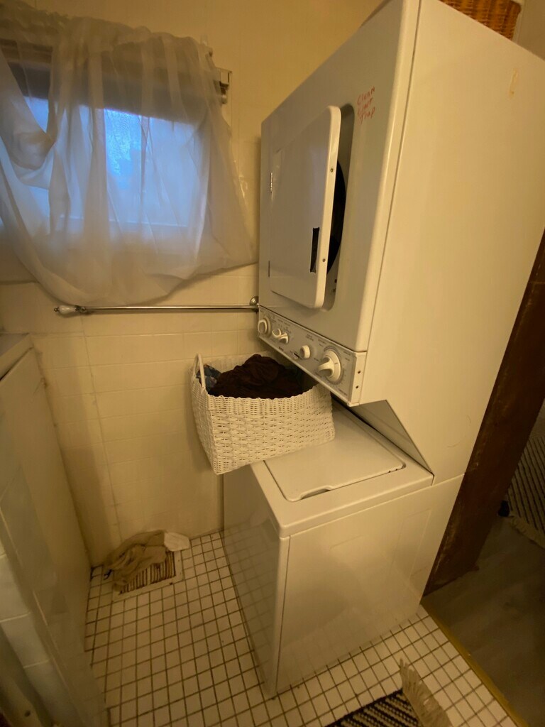 Washer and dryer in unit. Quiet, professional building. Across the street from public courtyard and brand new basketball court.
