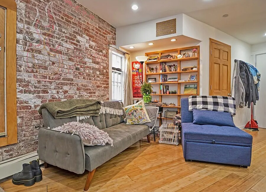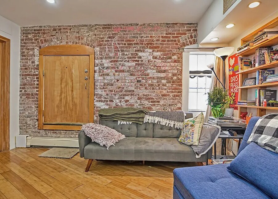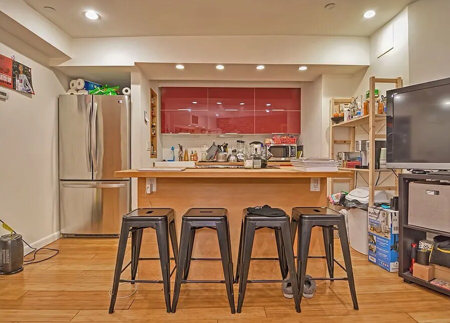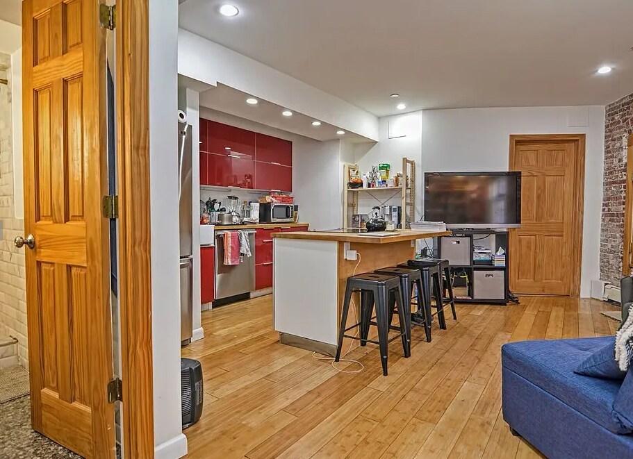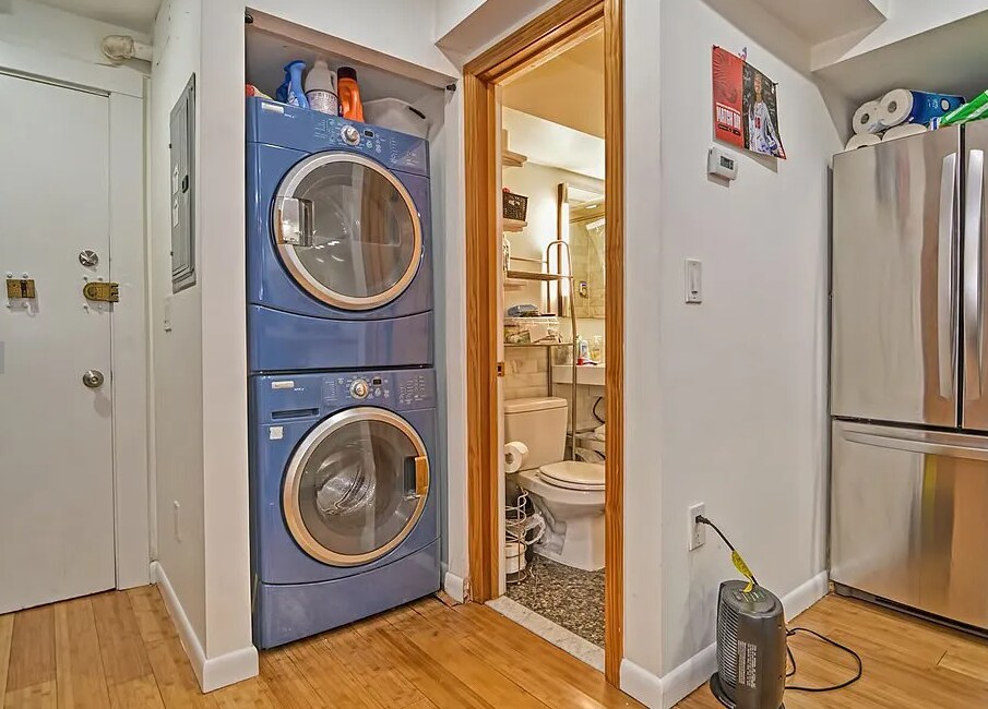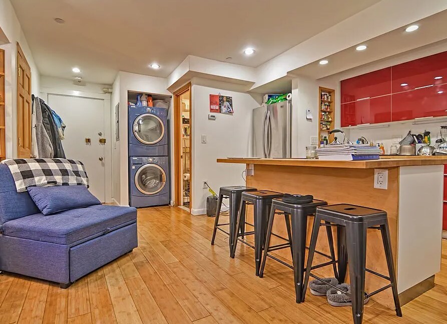 Modern design elements throughout! This chic garden level property features: - Hardwood floors in main living areas! - High end, fully equipped kitchen! - Stainless appliances - dishwasher! - Center kitchen island w/ breakfast bar! - Spacious open concept living room! - Charming exposed brick walls! - Generously sized primary bedroom! - Smaller yet sizable 2nd bedroom! - Updated luxurious tiled full bathroom! - In unit stacked washer & dryer!