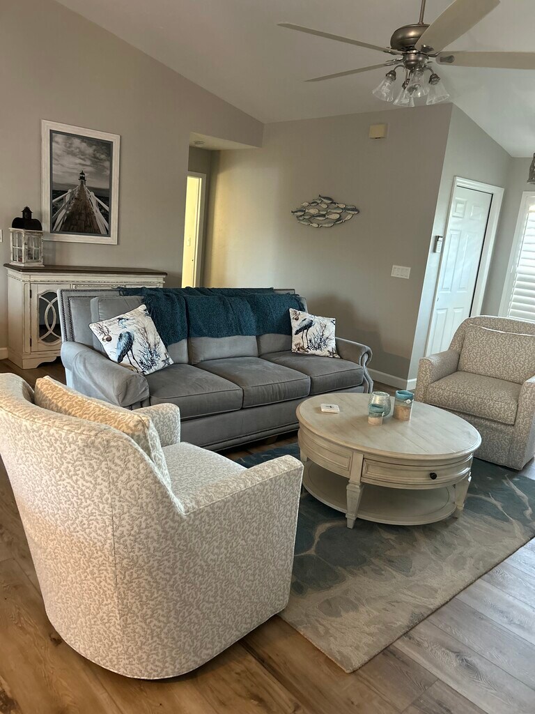 Fully furnished, beautiful. Completely renovated and within walking distance to shops, restaurants and Bonita Beach! 3 bedrooms, 2 bathrooms, waterfront property (at end of canal) that leads out to Gulf of Mexico).Culligan reverse osmosis drinking water system and water softener. Brand new kitchen with upgraded Bosch appliances. Vinyl plank floors throughout. The living space is on the 2nd floor and storage is on the 1st floor.
