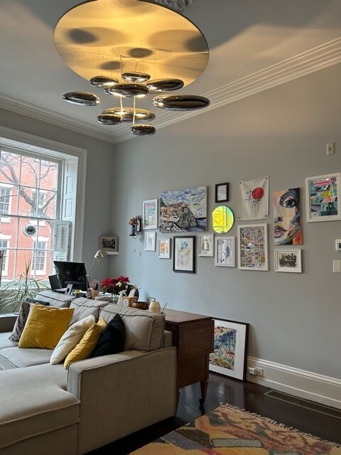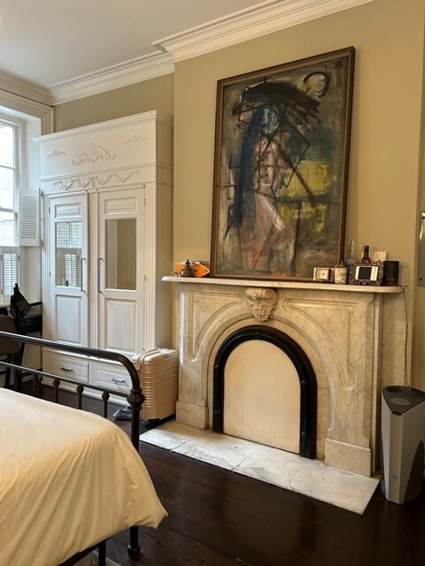 High-end 1 bedroom apartment in fabulous Society Hill building. This first-floor front unit has everything! Tons of sunlight flood this unit from the 2 large windows overlooking beautiful 4th and Spruce. Exquisitely finished hardwood floors are throughout. Custom window shutters, designer light fixtures, crown molding, original marble mantels in the living room, and bedroom with 2 closets (one cedar) and great window with nice light and privacy. Full bathtub and marble tile surround. This unit has it's own private washer/dryer right outside the unit door.