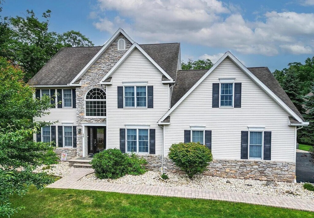 Available for as little as a 6-month lease. Partially furnished. Located in the sought-after Mountain Tops – Beautiful Grey Stone Manor development, this impressive corner-lot home offers space, comfort, and luxury throughout. Featuring four spacious bedrooms and four bathrooms (two full, two half), the layout is designed for both everyday living and entertaining. The modern kitchen includes stainless steel appliances and elegant granite countertops, opening to a warm and inviting family room with a stone fireplace. The first floor also offers a dedicated office, a formal living room, a generous dining room, and an open hallway with a dramatic second-floor overlook. Upstairs, the primary suite boasts an expansive bathroom and exceptional closet space. Three additional bedrooms, a convenient second-floor laundry room, and another full bathroom complete the level. The finished basement adds even more living space with a large family room and an additional bathroom, plus a new high-efficiency gas furnace. Outside, enjoy a large yard, an oversized two-car garage, and a heated in-ground pool—perfect for relaxing or entertaining. All of this comes with an unbeatable location close to the interstate, shopping, and top-rated schools.