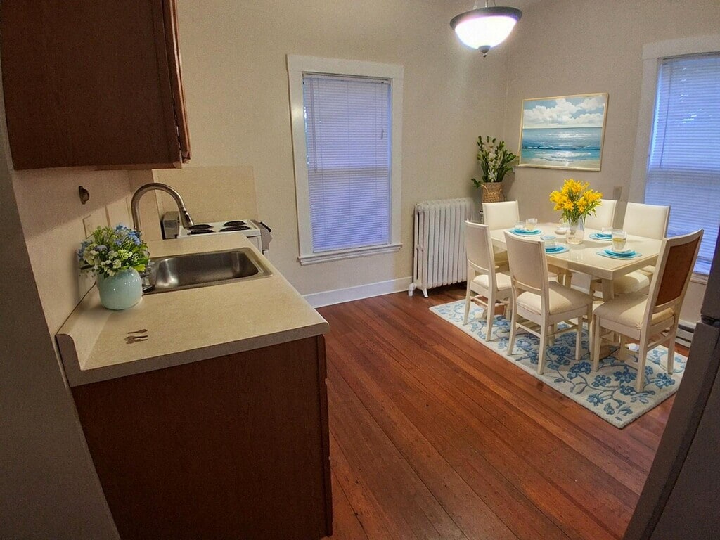 Beautiful sunny 1 bedroom apartment in grand home. This apartment has hardwood floors throughout and large living room and eat-in kitchen. There is direct access from the apartment to a back porch with gazebo to enjoy the gardens and tree covered back yard. A beautiful space to call home in a great neighborhood. Tree-lined, walkable neighborhood near the nature trails and ponds of the Middlesex Fells Reservation, tennis courts and public swimming pool. Short walk to "Highlands" commuter rail stop and Whole Foods Market. Hot water and sewer included. Laundry in building. Off-street parking for one car. Close to parks, restaurants and shops. No pets or smoking. Reference and credit application. Available October 15th.