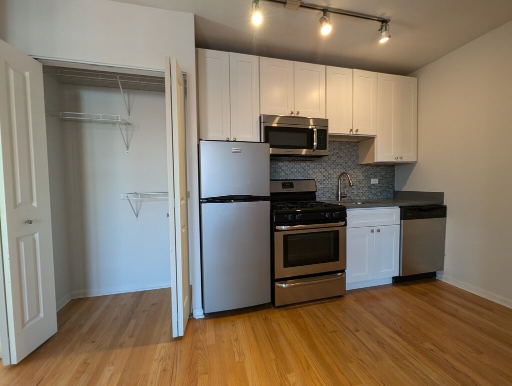 Renovated Logan Studio!~~Pet Friendly, one block from the California Blue Line and Palmer Square Park! Stainless Steel kitchen with dishwasher and microwave and a modern bathroom!