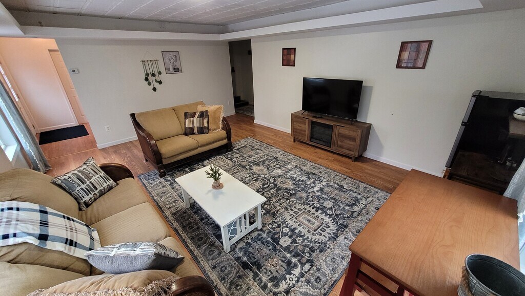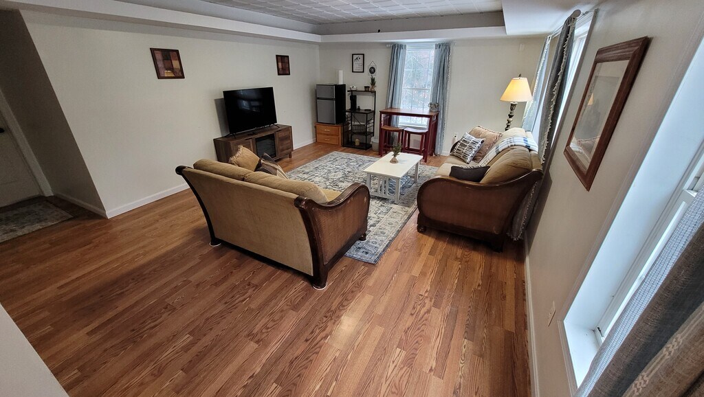 Monthly rent is $2350, which includes heat, water, sewer, internet, landscaping, yard mowing, driveway plowing, and designated parking. Electricity is not included. Charming 2-Bedroom Apartment Fully Furnished with Modern Amenities Discover the perfect blend of comfort and convenience in this charming two-bedroom apartment under 6 miles from the airport and shopping. The oversized kitchen, dining, and living room open out onto the back deck areas create a spacious and inviting atmosphere, ideal for entertaining or enjoying quiet evenings at home. Key Features: Family-sized Living: Enjoy a seamless flow between the kitchen, dining, and living areas, ideal for modern living. Fully Equipped Kitchen: The kitchen comes complete with appliances, making meal preparation a breeze. The island bar creates a great place to cook and serve. A coffee bar is available for your enjoyment. Outdoor Oasis: Step out onto the large back deck and take in the views of the expansive backyard—ideal for outdoor dining or relaxation. Convenient Amenities: The apartment includes a washer/dryer for added convenience. Comfortable Bedrooms: There is a generously sized queen bed in each bedroom offer ample space for rest and relaxation. Bedroom 1 has a private sitting room, and Bedroom 2 has a very cute reading nook. Modern Bathroom: Features a combo tub/shower in one bathroom and a large shower in the second for your convenience. This apartment offers a perfect balance of indoor and outdoor living, with all the modern amenities you need.
