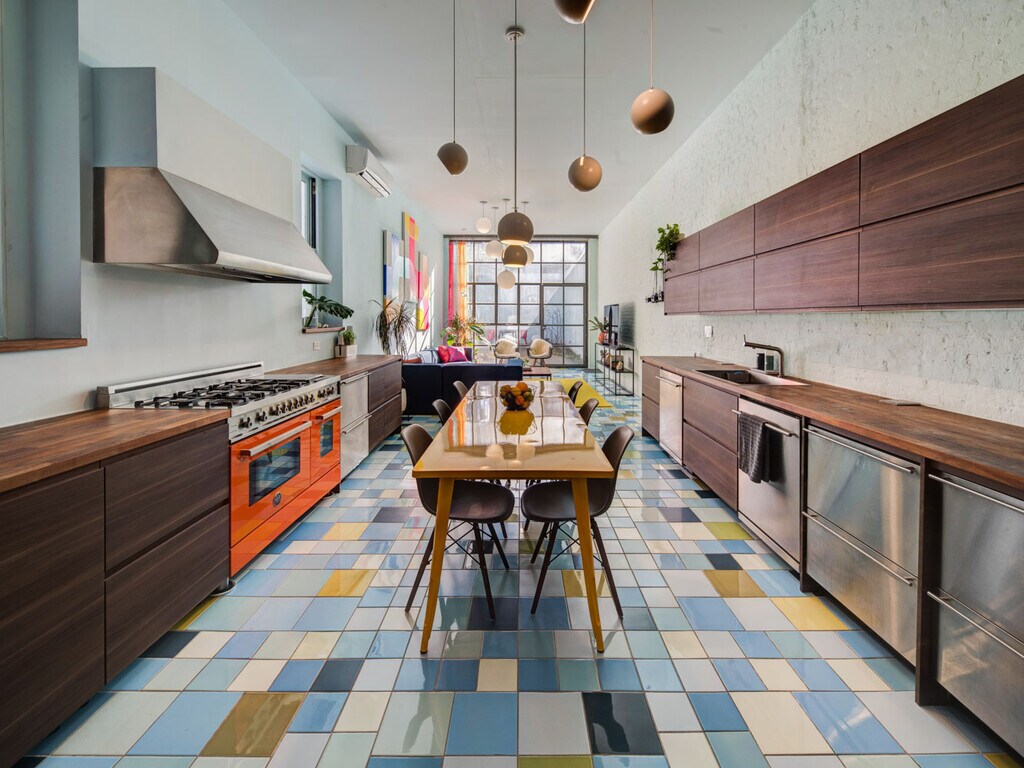 One of the coolest houses in Brooklyn - designed by the artist Jorge Pardo. Previously featured in Architectural Digest, this one of a kind converted carriage house offers bright, loft like proportions with soaring ceilings, skylights and walls of glass that seamlessly integrate indoor/outdoor living. With three en-suite bedrooms (plus an extra half bath), massive living area, a huge eat in kitchen and the kicker, you’re own private parking garage! After parking and entering through the private garage you are greeted with an entire floor dedicated to living and dining. Dramatic 12 foot ceilings, painted exposed brick, mosaic tiles, and a wall of south east facing glass that offers incredible light throughout the day. Not to mention the incredibly distinctive Red Spiral staircase. The kitchen was designed as the centerpiece of the home for cooking and entertaining. It features over 30 feet of counter space, a 6 burner Bertazzoni range with double ovens, 4 under counter fridge drawers, 2 under counter freezer drawers and 2 (!) dishwashers. At the back of the house is the living area with a wall of glass that lets in incredible light from the SE exposure. Out back is your private yard with 12foot surrounding walls that mimic the walls of the living space and create a seamless visual connection between indoors and outdoors – the space really does feel like an extension of the living room. Up the Red Spiral stairs you will find three en-suite bedrooms as well as a plethora of skylights and windows for more incredible light. The master bedroom suite is at the back of the house and features the same wall of glass as below. The bedroom is huge and fits a king size bed and plenty of room to spare – so much room, there’s a large soaking tub right in the bedroom! There is also tons of storage with drawers and hanging space. The en-suite bathroom is huge with a window and includes a walk in shower with rain head, a double sink and a toilet and bidet. The second bedroom suite is at the front of the house and is also a huge king size room with a massive skylight overhead. This bedroom also has a wall unit with built in desk. This room also has plenty of storage both drawers and hanging space. The en-suite bath has three large windows with a tub with shower, toilet and sink. The third bedroom is a queen size room with another massive skylight overhead. The sink and vanity mirror are both in the corner of bedroom and the en-suite bath has a large walk in shower with rain head and a toilet. Back down the Red Spiral stairs and there is a finished basement – perfect for an art or music studio, play room or media/screening room. There is also a half bath and laundry with washer and dryer. The distinctive mosaic tile throughout the house is radiant heated and feels incredibly warm under foot during the winter months and cool in the summer months thanks to the zoned AC throughout. The house is conveniently located in the heart of Bushwick and is surrounded by amazing bars, restaurants, coffee shops and incredibly close to transportation. This property really does need to be seen to been appreciated. Viewings will by by appointment only so please reach out to schedule a showing. There is NO BROKERS FEE. The house can be delivered furnished or partially furnished for for an extra fee.