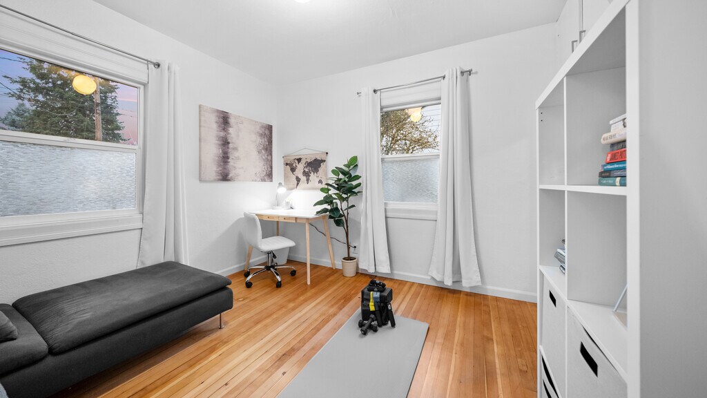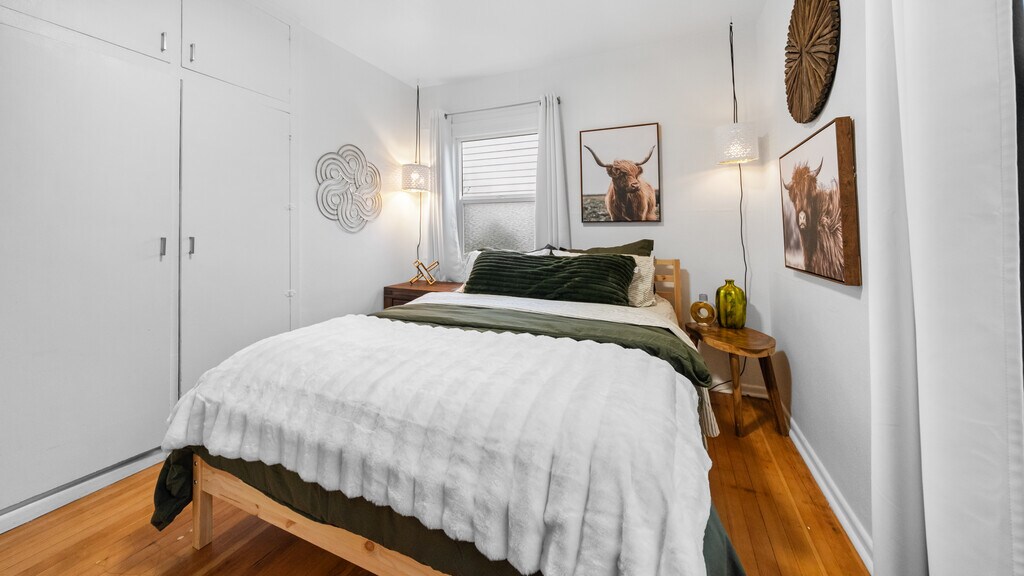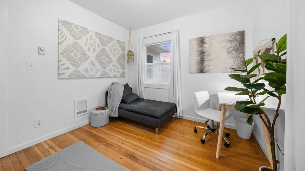 Welcome to this beautifully renovated 2-bed, 1-bath craftsman home designed for comfort, convenience, and a truly cozy stay. The primary bedroom features a plush queen bed with a memory foam mattress, high-quality linens, and blackout curtains throughout the home to ensure restful sleep. The second bedroom offers a twin trundle and a dedicated workspace—perfect for guests, children, or remote work needs. The home is fully furnished and thoughtfully stocked with all the essentials to make settling in effortless. A shared laundry area is located in the basement for your convenience. Enjoy two private, fully fenced outdoor spaces ideal for relaxing or unwinding after a long day. You’ll also have dedicated upfront parking and optional access to exterior security cameras for added peace of mind. Experience the charm, comfort, and quiet simplicity of this inviting craftsman retreat—your home away from home.