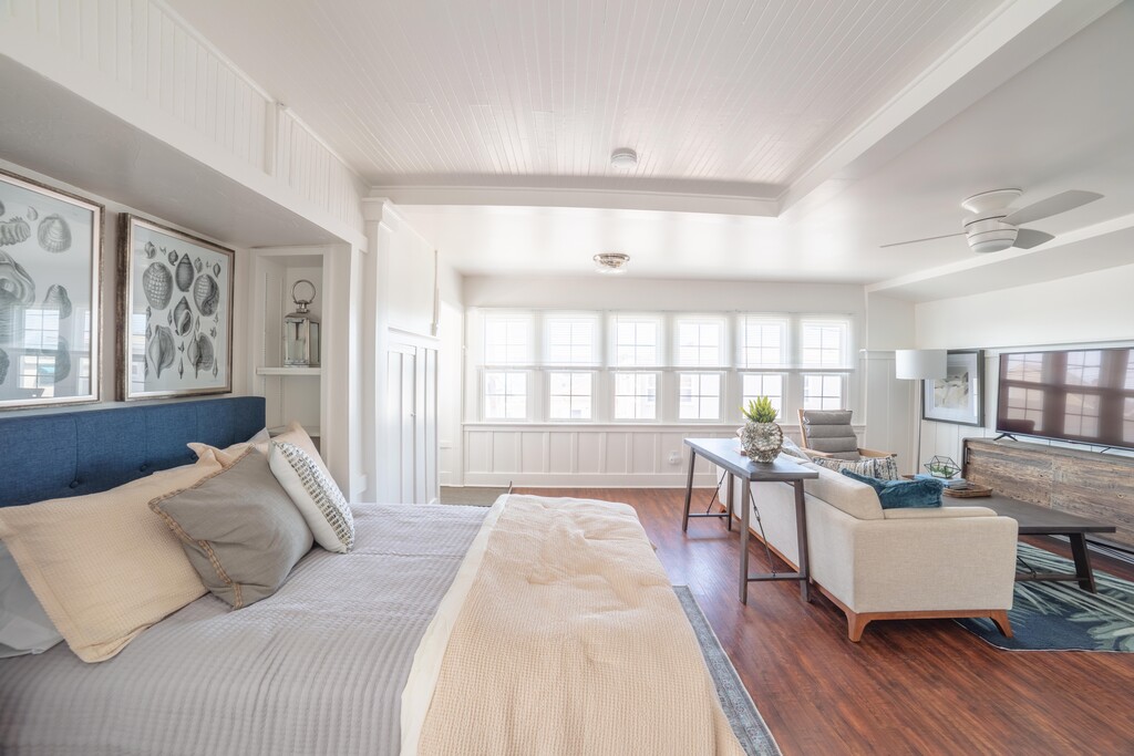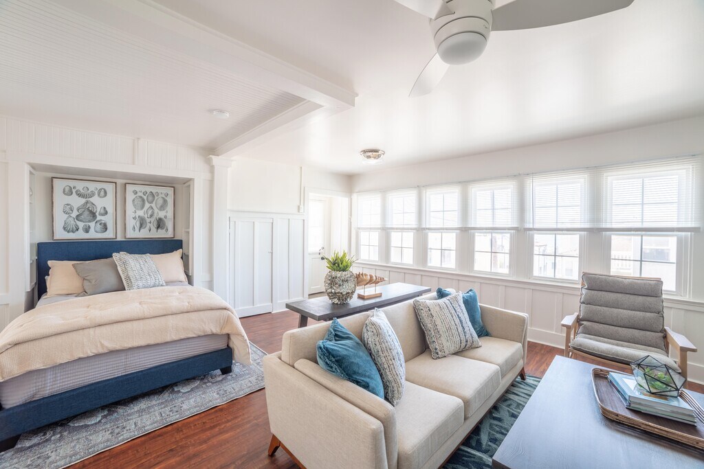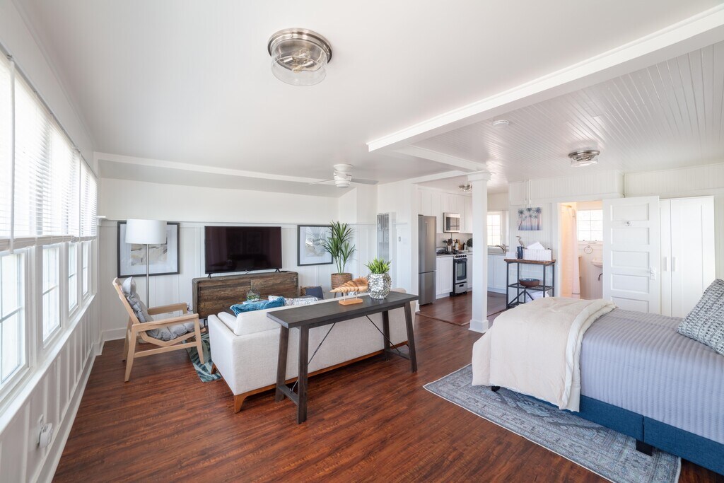 Furnished Rentals (1-11+ Month Terms) A charming upper unit studio (1-Full) 1-Bath with ocean views just steps to the beach! This super cute unit is at the back of a walk street house. This unit is the upper unit with a sitting area and ocean views. Tastefully remodeled by a designer with impeccable taste! Comes with a new kitchen, bathroom, paint, carpet, and heating along with free street parking. It's an old building with lots of wainscoting wood treated walls and ceilings as you can see from the pictures! Prices go up during the Summer months. Sorry no pets!