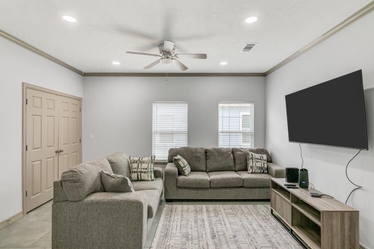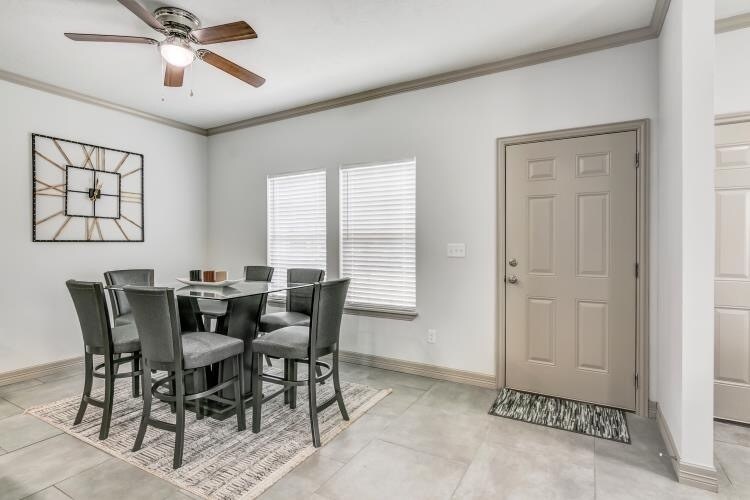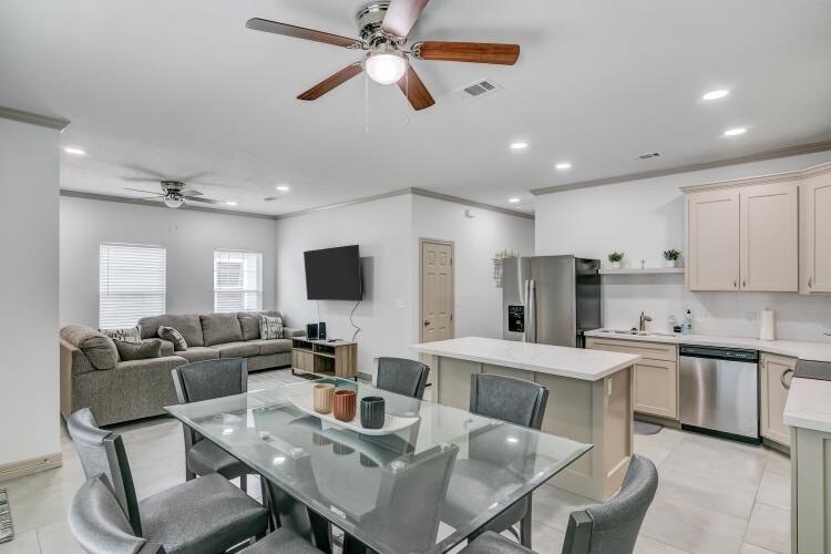 Perfect for all corporate clients. Stay in this fully furnished duplex. Quiet neighborhood! You will be welcomed into a 1350 sq. ft 3 bed, 2 bath duplex in Beaumont, Texas. This spacious and newly built home will transform you from city to sanctuary with its comfy living area and easy access to the I10 highway. Just minutes from the hospitals, restaurants and refineries. One car garage and outside parking area's all free. Security cameras. Fenced property. Quartz Island countertops in Kitchen and throughout kitchen. Quartz in both bathrooms counter tops.