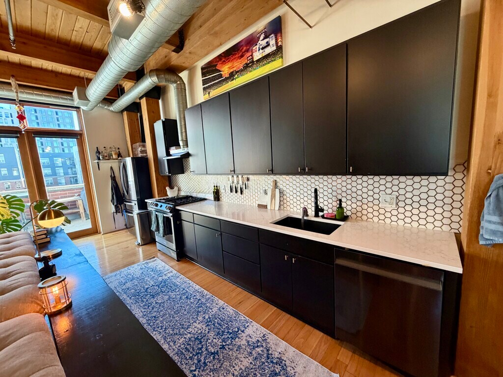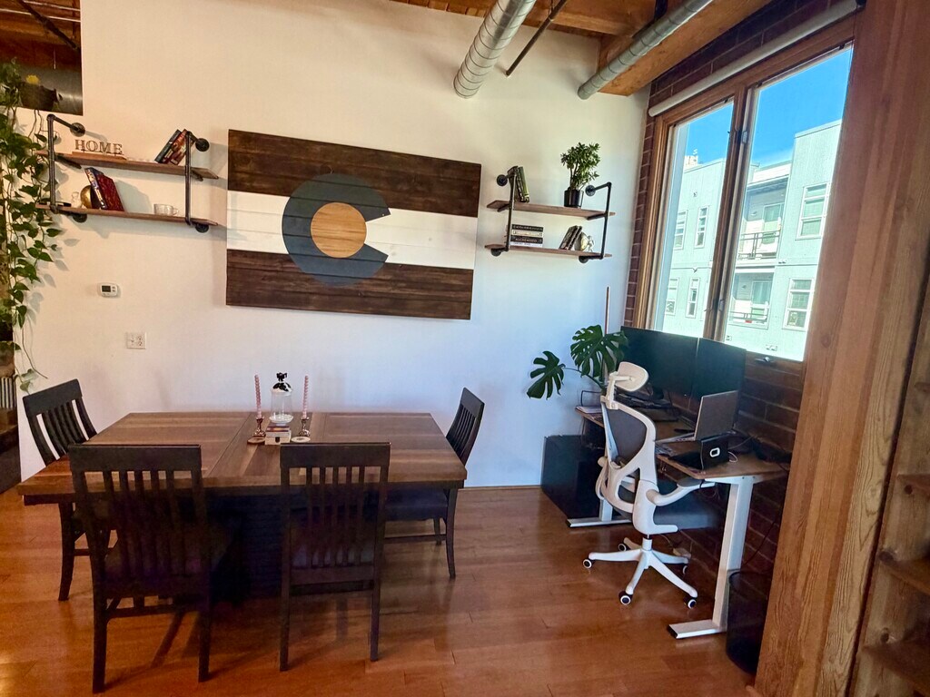 Urban Industrial Luxury in the Heart of Downtown Denver Experience the pinnacle of Mile High living in this stunning, sun-soaked industrial loft. Located in the vibrant center of Downtown Denver, this unit perfectly blends raw architectural character with modern, high-end finishes. From the exposed brick walls and heavy timber beams to the massive private balcony, this is the ultimate sanctuary for the urban professional. The Living Space: Industrial Soul meets Modern Comfort Step inside to an expansive open-concept layout defined by soaring ceilings, original wood beams, and authentic exposed brick. Designer Kitchen: A chef’s dream featuring sleek matte-black cabinetry, crisp white quartz countertops, and a classic hexagon tile backsplash. The kitchen is fully equipped with premium stainless steel appliances, including a gas range. Entertainer’s Dream: The seamless flow from the kitchen to the living area makes hosting effortless. The living room boasts oversized windows that flood the space with natural light, highlighting the rich hardwood floors throughout. The Ultimate WFH Setup Designed for the modern lifestyle, this unit offers a dedicated built-in workspace. Whether you need a quiet corner for deep work or a sprawling setup for multiple monitors, the built-in shelving and industrial-pipe accents provide a stylish and functional environment to stay productive without sacrificing your living space. An Outdoor Oasis The true "crown jewel" of this loft is the massive private balcony. Rare for downtown living, this expansive outdoor area offers: Breathtaking views of the Denver skyline. Ample space for a full outdoor dining set, lounge seating, and a grilling station (complete with both gas and electrical hook-ups). It is your own private park in the middle of the city. Thoughtful Details Entryway & Storage: A functional foyer featuring industrial corrugated metal accents and ample space for gear. Architectural Flair: Custom barn doors, exposed ductwork, and unique lighting fixtures throughout. Location: At the Center of it All You are steps away from the very best of Denver. Walk to Union Station, catch a game at Coors Field, or explore the endless list of award-winning restaurants and breweries in LoDo and RiNo. With immediate access to the light rail and Cherry Creek Trail, the entire city is at your doorstep. Don’t miss the chance to call this iconic Denver loft your home.