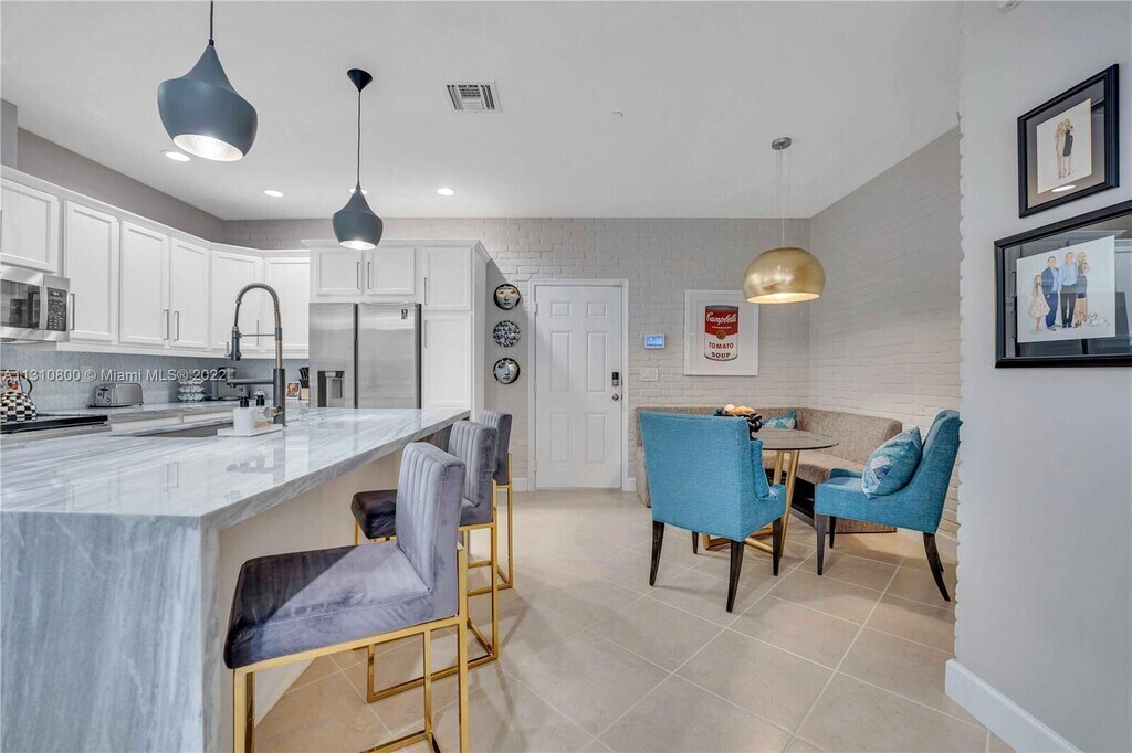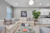 Stunning, light-filled residence featuring a spacious open-concept layout with designer finishes throughout. The modern kitchen showcases crisp white cabinetry, stainless steel appliances, and an oversized waterfall island,perfect for everyday living and entertaining. Sleek pendant lighting, recessed lights, and elegant tile flooring enhance the clean, contemporary feel.The living and dining areas flow seamlessly, offering ample space for relaxing or hosting. Thoughtfully designed accents, statement lighting, and curated details create a stylish yet comfortable atmosphere. The powder room adds a unique designer touch, while large windows allow for abundant natural light