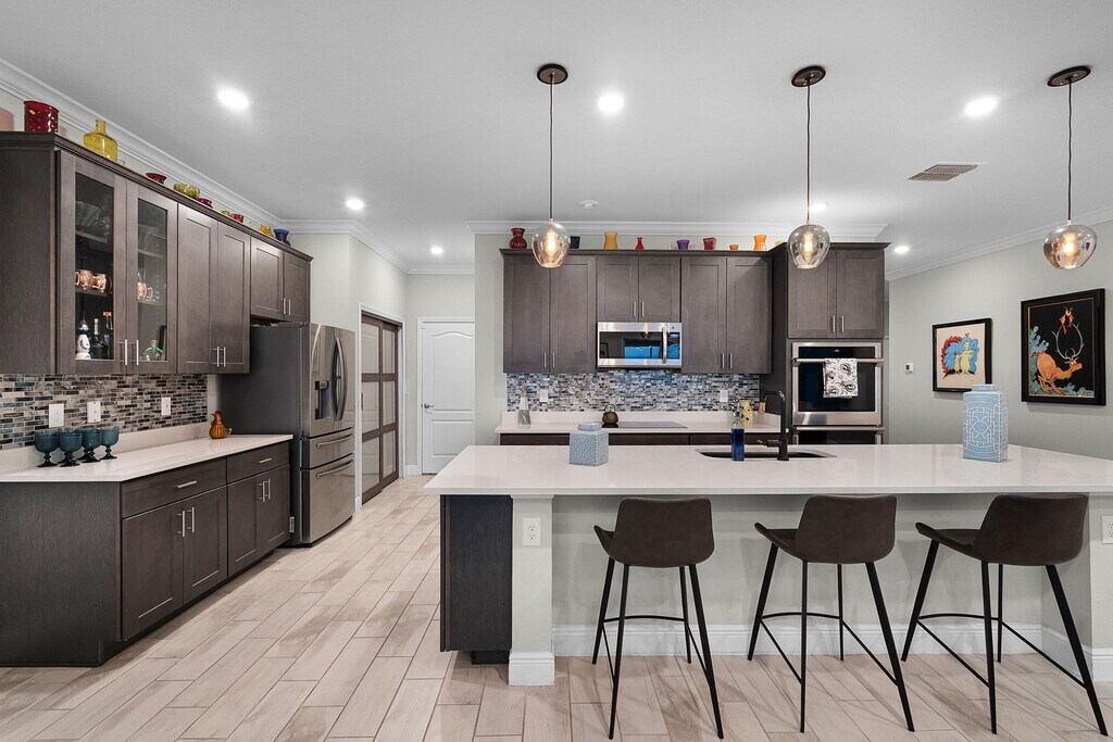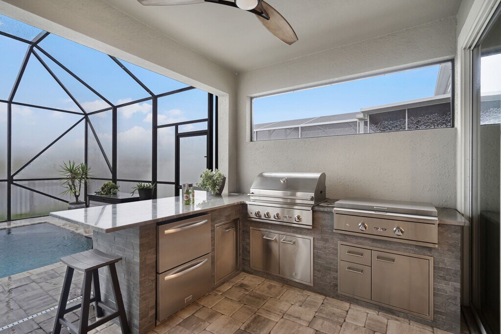 Pool Home with Awesome Outdoor Kitchen. Welcome to 298 Jackson Loop, DeLand, FL 32724 - a beautifully appointed, custom-built home loaded with upgrades inside and out. The heart of the home is the gourmet kitchen, featuring quartz countertops, a large center island with breakfast bar, large pantry, cooktop, built-in double oven, refrigerator, microwave, and dishwasher, making it a dream for both everyday living and entertaining. The open layout includes a spacious family room with dual sliding glass doors, a dedicated dining room, and soaring 9'6'' ceilings that create a bright, airy feel. Throughout the home, you'll find tile flooring in the main areas and plush carpet in the bedrooms. The expansive primary suite offers a luxurious escape with a freestanding soaker tub, walk-in tiled shower with glass enclosure, dual vanities, and a large walk-in closet. Step outside to your private backyard retreat featuring a screened-in, heated saltwater pool with hot tub, waterfall, and a custom paver deck. Enjoy year-round outdoor living with a fully equipped summer kitchen, complete with granite countertops, a flat top grill, traditional grill, and TV hookup, all under a covered, screened-in porch. The fenced-in backyard provides privacy and space, while the front yard is enhanced with a full irrigation system. Additional upgrades include plantation shutters, impact-rated windows and doors, stone exterior accents, and dual sliders that create seamless indoor-outdoor flow. This home checks every box with style, functionality, and location, nestled in a quiet community near downtown DeLand, top-rated schools, shopping, and easy access to I-4. Move-in ready and built to impress, 298 Jackson Loop is the total package. Pool maintenance is included………..Will consider a 6 month lease for $3275 per month