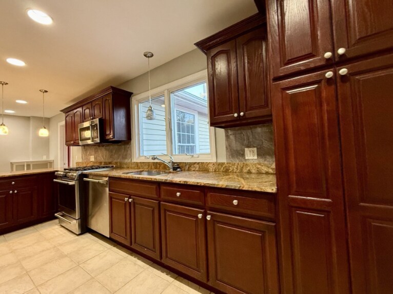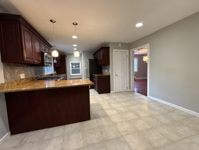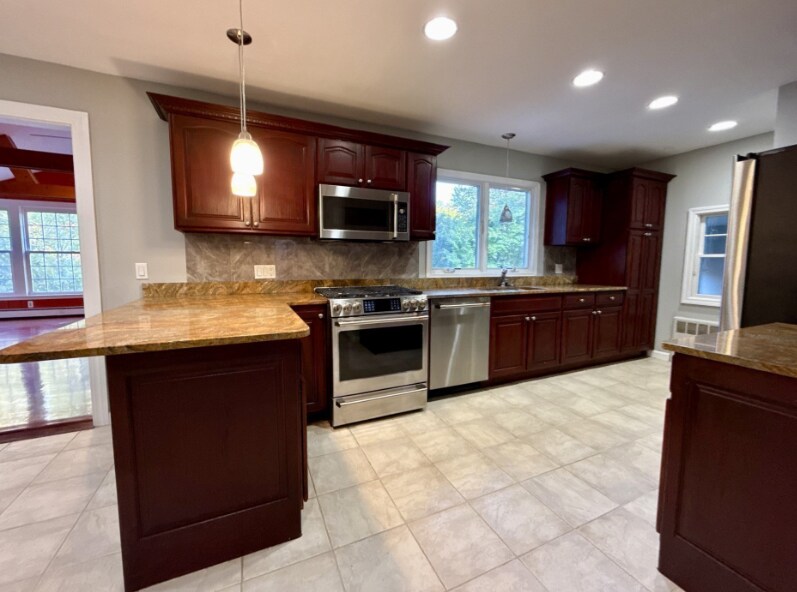 Amazing opportunity to lease this adorable Cape in a wonderful Bedford neighborhood. This home features 4 bedrooms, 2 baths, a large eat in kitchen with granite countertops, stainless steel appliances, a mudroom. The open floor plan includes a dining area and a cozy living room with gleaming hardwood floors. Enjoy a gorgeous sun filled family room with cathedral ceilings and sliding doors leading to a spacious patio overlooking a private backyard. The finished lower level offers great space for family use, a home office, gym, or guest suite. Convenient location close to schools, shops, restaurants, and major routes.