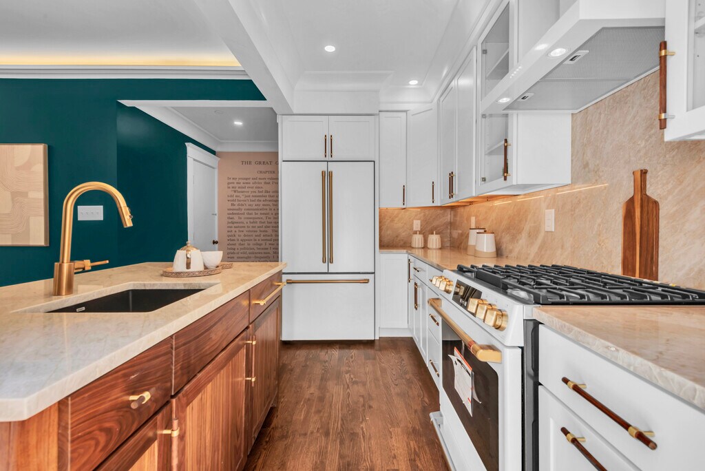 This gut renovation was designed as our personal residence - no expense was spared. This exquisite 2-bedroom, 1-bath Murray Hill apartment seamlessly blends historic charm with contemporary luxury. Every detail has been carefully curated to create an exceptional living experience. The Kitchen & Bar feature custom white cabinetry and GE Cafe appliances with brass hardware. The show-stopping centerpiece is a bespoke bar complete with a handmade brass sink imported from Italy, paired with a Zephyr dual-zone wine fridge. A real walnut wood island serves as both functional workspace and design statement. Quartzite Taj Mahal countertops and backsplash are beautifully illuminated by under-cabinet lighting. A door opens to your private paver stone patio, your personal retreat for grilling and summer entertaining. Living Spaces showcase an original pocket door from the early 1900s that gracefully separates the living and dining areas. A retrofitted gas fireplace provides warmth on winter evenings. Modern central air conditioning has been seamlessly integrated to ensure year-round comfort. The Hallway is a literary masterpiece: floor-to-ceiling custom wallpaper features the opening chapter of The Great Gatsby, magnified so you can read the first pages as you walk. It's a conversation starter and a daily escape into classic American literature. The Bedrooms are serene retreats featuring aromatic cedar-lined closets and brass ceiling fans. The primary bedroom connects seamlessly to this immersive Great Gatsby experience with custom wallpaper and brass wall sconces. The Bathroom is a spa-like sanctuary with Italian marble tiles and radiant floor heating. The statement piece is a solid marble console vanity with unlaquered brass hardware that will develop a beautiful patina over time. A spacious walk-in shower with glass sliding doors completes the luxe experience. Additional Features include an unfinished basement with new concrete flooring, perfect for storage, plus a brand-new LG washer and dryer. This is not just an apartment, it's a curated lifestyle. A Note on Viewing: The photographs simply cannot capture the craftsmanship, materials, and meticulous design of this space. We strongly encourage you to experience it in person.