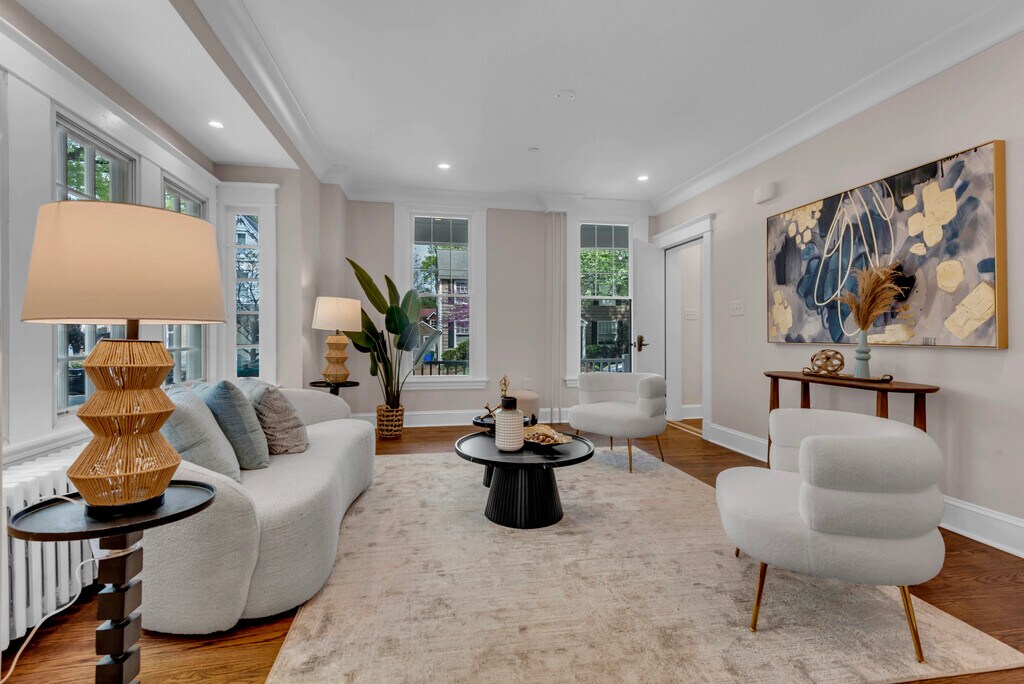 This gut-renovated 3-bedroom plus bonus room apartment blends historic charm with premium modern comfort. A generous entry hallway welcomes you with space for a bicycle, stroller, or seasonal storage. New stain- and wear-resistant yacht-grade carpet lines the stairs, combining durability with elegance. From there, the apartment unfolds across two thoughtfully designed levels. The main level features the heart of the home: a well-appointed kitchen and dining area naturally separated from the living room, creating defined spaces for both gatherings and quiet retreats. The beautifully designed kitchen includes GE Cafe appliances, a custom black composite sink, quartzite countertops and backsplash, and a generously sized pantry. A peninsula island seats four, ideal for casual dining and entertaining. The primary bedroom easily accommodates a king bed plus furniture and offers a walk-in closet. A second bedroom on this level is compact but functional, with its own closet. A full bathroom features a large vanity top, striking gold tile accent wall, and a marble tile shower-tub combo. The living room stands out with multiple windows flooding the space with natural light and a new gas fireplace with marble surround, walnut mantel, and shiplap focal wall. The upper level offers excellent versatility with one additional bedroom and a bonus room, perfect for a home office, guest suite, nursery, or creative workspace. Original pine floors have been carefully sanded and refinished, preserving historic character while enhancing durability. The second full bathroom is smartly designed with a spacious walk-in shower, skylight for natural light, and a console sink with medicine cabinet for ample storage. Additional highlights include a brand-new top-of-the-line LG washer/dryer and central AC. This is sophisticated apartment living with the space and soul of a home.