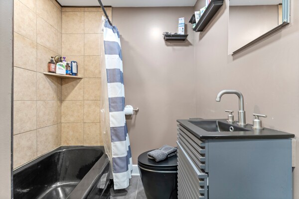 Spacious second floor one bedroom one bath apartment with great natural light. Large bedroom with plenty of space for a full setup. Bright living room with hardwood floors. Updated kitchen with island and stainless steel appliances. Full bathroom with tiled shower and tub. Private second floor balcony perfect for relaxing outdoors. Separate mudroom for storage or extra space. Laundry available in the basement. Comfortable layout with good flow and natural light throughout.