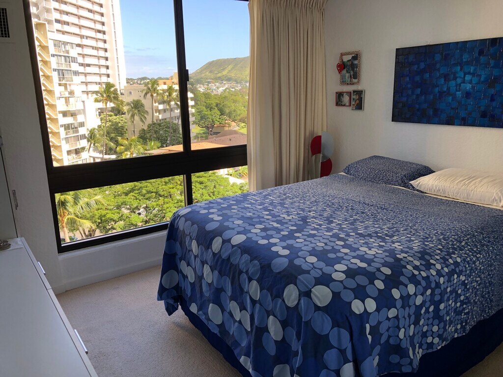 For Rent is a Larger sized Fully Furnished Renovated 620 square foot 8th floor corner unit in beautiful Liliuokalani Gardens. Available on February 15 2026. ( Could possibly be a bit earlier) This unit is larger than most One Bedroom Apartments in the Complex, and has a Separate Dining/ Den/Computer room. The Tree top View is of Diamond Head and the Mountains and Pool. Central A/C in all rooms. Large Swimming Pool, Jacuzzi, Flood lighted Tennis Courts, Koi Ponds, Lush Gardens, Barbecue area's and Pool House. Few mins walk to Waikiki Beach, Tiki's Bar and Grill Kapiolani Park. 55" Smart TV, all Kitchen and Bathroom Items included. Tranquil Waikiki Resort type Living with 24 hour security. Quieter Queen Tower. Minimal Road Noise. Includes Electric, Water, Internet and Cable TV and 1 Parking Stall. Coin Laundry on Lobby Level. No Smoking, No Pets. 6 or 12 month Lease.
