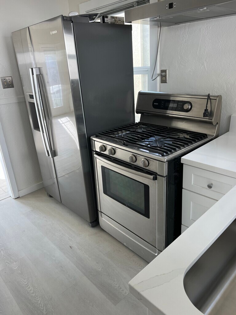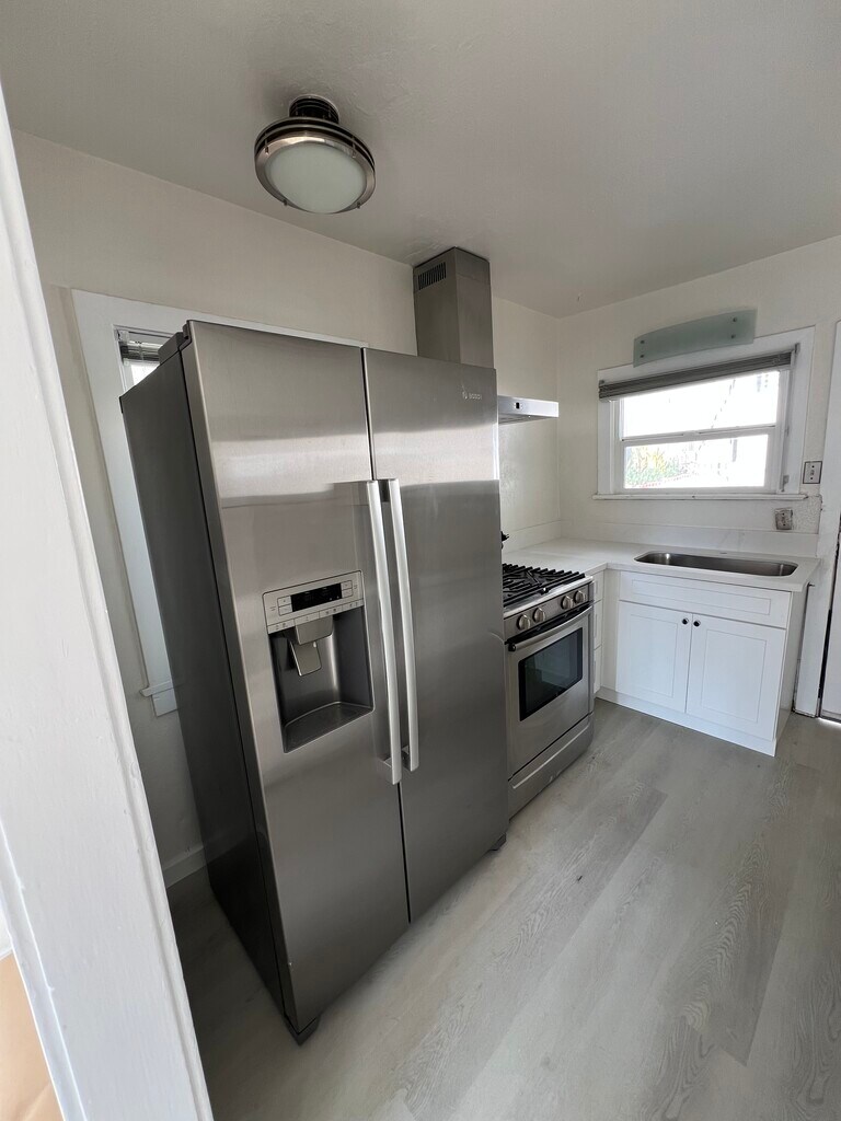 Ocean View Beach House w lovely backyard patio and front ocean facing balcony. Newly remodeled w/new tile flooring, newly remodeled kitchen, new paint, Bosch High End appliances, ceiling fans, lighting and new large double paned windows. Light and bright and 2 short blocks to the beach! Enclosed garage w Washer / Dryer hookups & additional storage included. Exterior parking available. Centrally located between downtown Manhattan Beach and North Manhattan Beach.