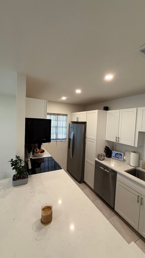 Large & beautiful 2 bedroom, 2 bath apartment in nice, quiet east Delray Beach neighborhood. Apartment is a front unit in a single-story triplex building. This apartment is in the highly desirable Tropic Palms neighborhood with a nature preserve directly behind the property...very private, peaceful, and beautiful with a travertine stone outdoor patio area. The apartment has a huge living room, dining area and beautiful large kitchen including wooden cabinets, new stainless steel refrigerator (temporary fridge is shown in photos), dishwasher, disposal, stove, oven, microwave, etc. New tile throughout, central air conditioning, new ceiling fans with remote control lights. Huge master bedroom with new remote control ceiling fan and oversized walk-in closet and bathroom with glass shower, new tile, new toilet, gorgeous new vanity and countertop. Laundry room with new washer and dryer and ample storage space. Just north of the Boca Raton city limits in east Delray Beach near Trader Joes, Whole Foods, shopping, & more. Less than 1 mile to beach and minutes from Atlantic Avenue, Boca Raton, Delray Beach, and minutes from I-95. 12 month lease. Pets OK. $2,440 per month. No smoking. Tenant pays for electricity, internet, etc. Water/sewer/trash is billed to each apartment at $70/month. Pets OK. Two dedicated parking spots plus an additional guest spot (shared) and ample street parking. Nice large City of Delray heated pool and club in the neighborhood with reduced rate for residents. Call with any question or to schedule a showing. $2,440 per month. Available Sept 28.