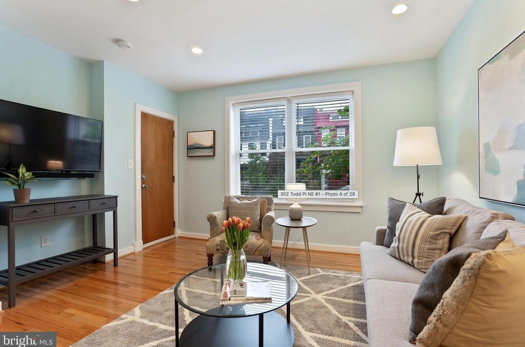 Welcome to 302 Todd Place NE, unit 1--one of the cutest 2-bedroom units on one of the friendliest and most charming blocks in Eckington! This home has everything you need and want: a newly-renovated kitchen with stainless appliances and gas cooking, granite countertops and a roomy bar for entertaining, hardwood floors throughout, HUGE closets, great natural light plus recessed lighting to set the mood, in-unit washer/dryer, a spacious bath with shower/tub, AND off-street parking. Pet friendly with a Walk Score of 82 and a Biker's Score of 93! This is an amazing opportunity to get into a move-in ready home in one of DC's hottest neighborhoods.