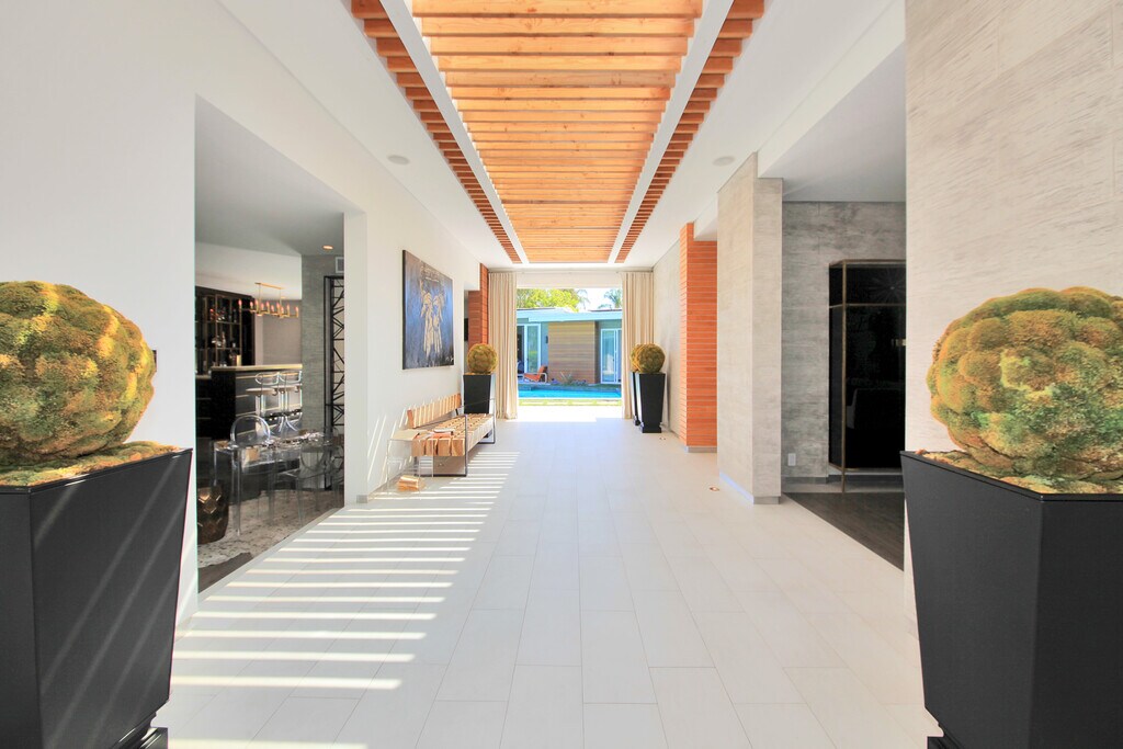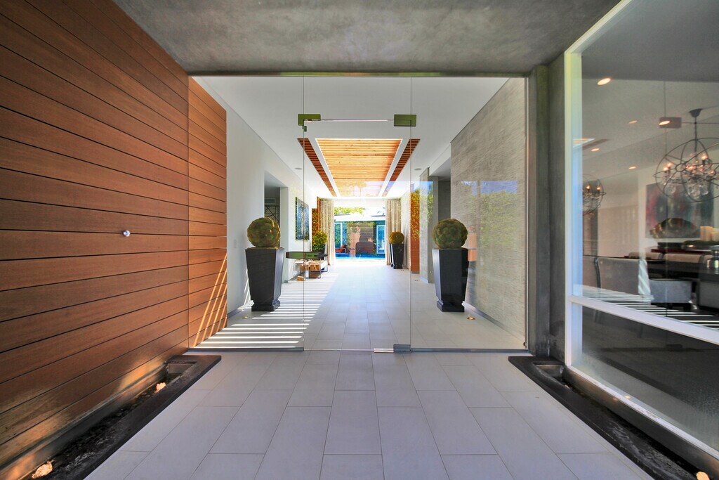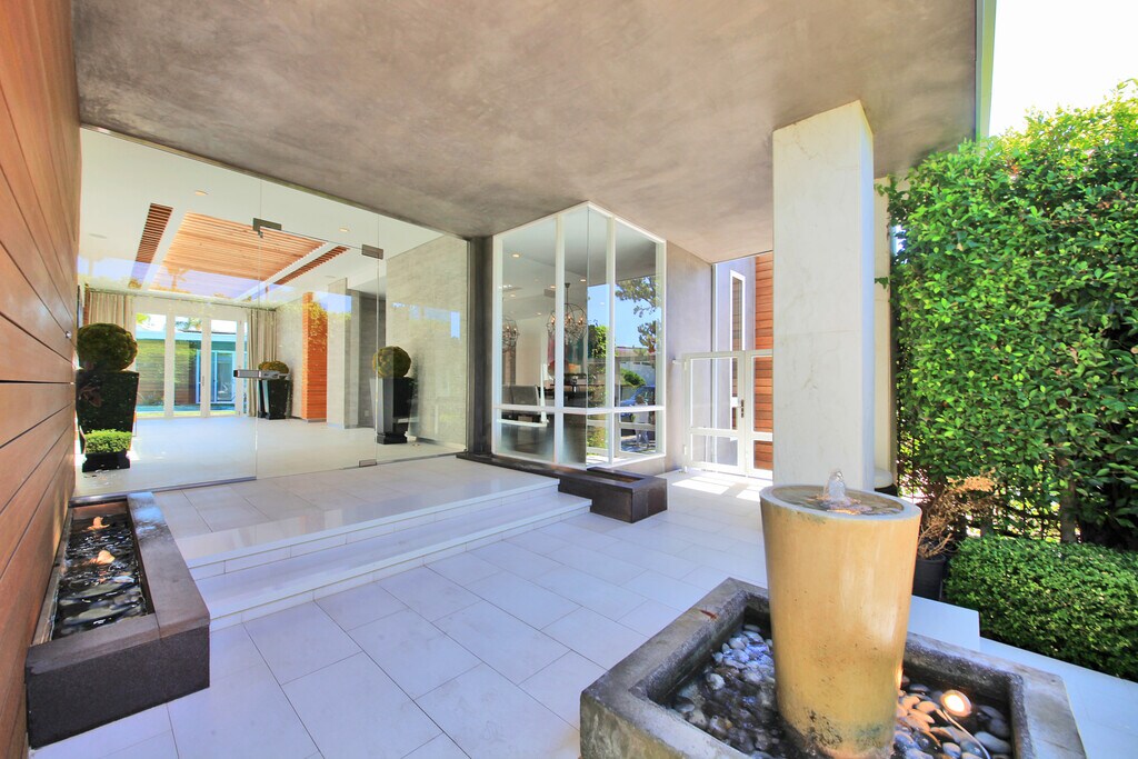 Nestled in one of Brentwood's most sought-after neighborhoods, this completely remodeled contemporary masterpiece blends luxurious design with effortless indoor-outdoor living. From the stunning grand formal entry, you're greeted with breathtaking sight lines to the sparkling pool and an abundance of natural light pouring through expansive glass doors and windows. The open floor plan boasts 4 spacious bedrooms and 4 1/2 spa-like bathrooms, including a serene primary suite with a generous walk-in closet. The chef's kitchen is a showpiece, featuring a massive center island, high-end stainless steel appliances, custom built-ins, and a skylight that floods the space with sunlight while framing views of the lush backyard. Perfect for entertaining, the private custom bar overlooks the pool, while multiple seating areas invite al fresco dining with views of the city lights and mountains. The resort-style backyard offers a sanctuary-like atmosphere, complete with seamless indoor-outdoor flow, manicured greenery, and an inviting pool deck. Additional highlights include soaring ceilings, recessed lighting, designer chandeliers, two elegant fireplaces, and meticulous custom finishes throughout. Every element of this home has been crafted to create a tranquil escape from the city's hustle and bustle. An ideal blend of sophistication and comfort in the heart of Brentwood. Pool is currently covered as owners have small children. Home can be delivered with the pool covered or with the pool open as shown in photos. Home can also be leased fully or partially furnished at a premium. Call to inquire.