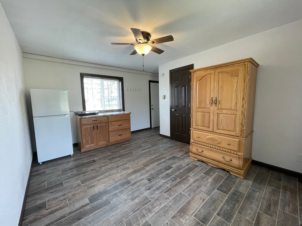 This is a one-room studio apartment with a full bathroom, cooktop, and full-size refrigerator. All utilities included in rent except cable and Internet.