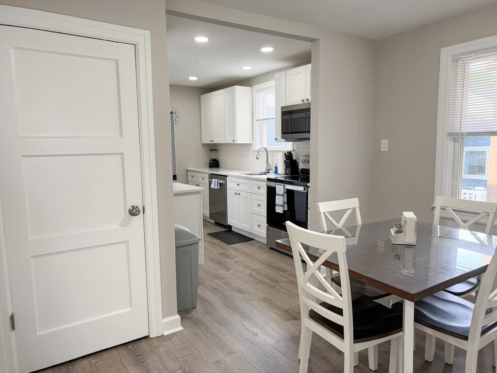 The Retreat at Holly Oak is a beautifully renovated and furnished 1st floor, 2 Bedroom / 1Bath unit, situated in the charming Holly Oak area of North Wilmington! Utilities are included. This unit is one of three units on the property that has been completely updated with modern finishes and thoughtful details. The brand-new kitchen boasts stylish shaker cabinets, sleek quartz countertops, and energy-efficient stainless steel appliances. The renovated bathroom features a ceramic tile tub surround, while the entire unit shines with durable and attractive LVP flooring and fresh neutral paint. Both bedrooms offer ceiling fans and large closets for ample storage, as well as blinds and blackout curtains for your convenience. Enjoy the cozy enclosed front porch, perfect for relaxing, and take advantage of off-street parking for two cars. This home is ideally located near area hospitals, shopping, restaurants, and parks, with easy access to I-95 and Philadelphia. The property is also home to two separate fully furnished 1BR/1BA units. Each tenant benefits from a private washer and dryer, along with a large, secure storage locker in the shared basement space. Don't miss the opportunity to book this beautifully renovated rental home!