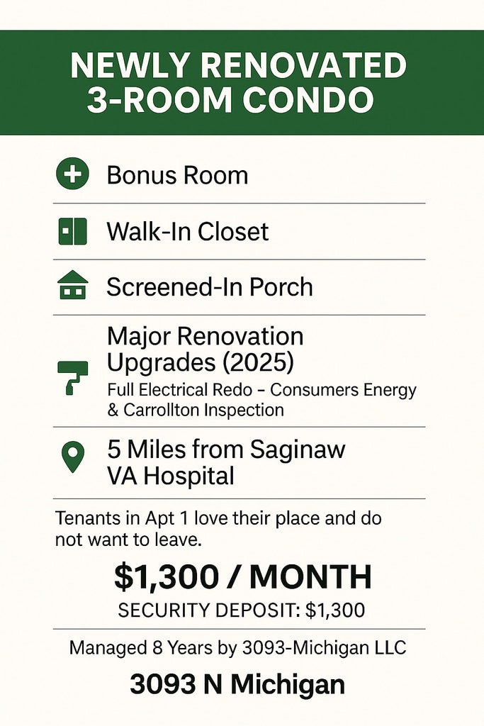 Spacious & Cozy Upstairs Home — 3-Room Layout + Bonus Room Address: 3093 N Michigan, Carrollton Township, MI This updated upstairs unit offers a peaceful, homeowner-style living experience in a quiet 4-unit property with professional, long-term management. Unit Features • 3-room layout (living + flex space + dining nook) • 2 bedrooms with closets • Bonus Room — ideal for gaming, office, or hobby space • New appliances • Private screened porch entry • Rebuilt staircase (2025) • Bright upstairs layout with natural light Layout Description Screened porch entry ? kitchen/dining nook ? bathroom to the right ? Bedroom 2 adjacent ? Bedroom 3 with attached bonus room. Property Highlights This property is a converted home offering a comfortable setting with well-maintained common areas and experienced management. Residents enjoy porch areas, yard space, and convenient access to nearby amenities. Nearby • Shell Gas Station across the street • 5 miles to Dollar Tree, restaurants, Dow Event Center • 8 miles to Saginaw’s 70th District Court restaurant district • Minutes to Saginaw VA Hospital Rent & Terms • Rent: $1,300/month • Security Deposit: $1,300 • No washer/dryer hookup • Managed by 3093-Michigan LLC