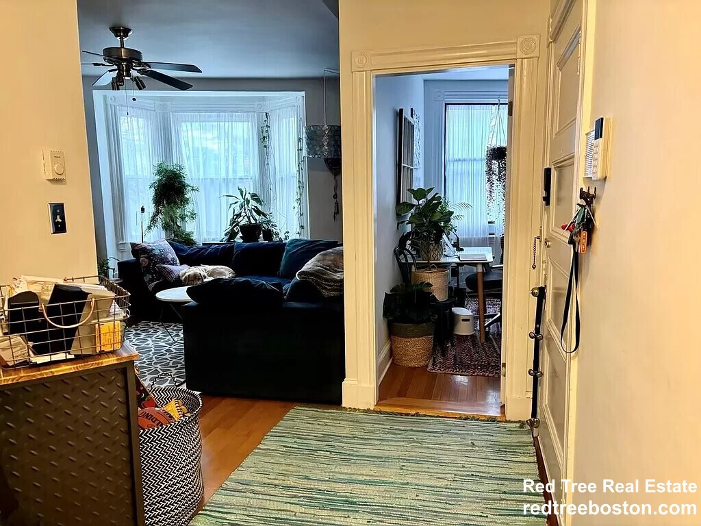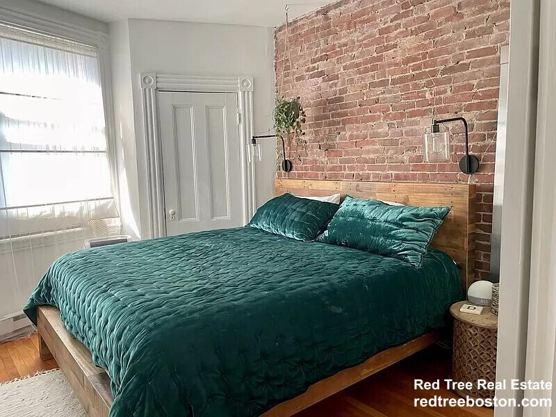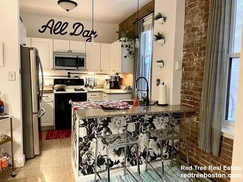This beautiful pet-friendly 1240 square foot unit with tree-top views (located on the second floor) has high ceilings, hardwood floors, exposed brick throughout, bow front windows, a gas fireplace, and a private laundry room (full-sized washer and dryer included). The renovated eat-in granite kitchen has stainless steel appliances, oversized windows with custom blinds, and a large pantry closet. Tons of storage space throughout the unit as well as a walk-in closet in the master bedroom. Extra storage for bikes and strollers is also available in the building. Located across the street from the Brookline Village T stop on the Green Line. This unit is close to fine restaurants, interesting shops and town facilities (Brookline Town Hall, Brookline Library, Brookline Police Station), and is an easy walk to Longwood Medical Area. Small pets are permitted. Private Parking spot available down the block in a parking garage for $250/month.