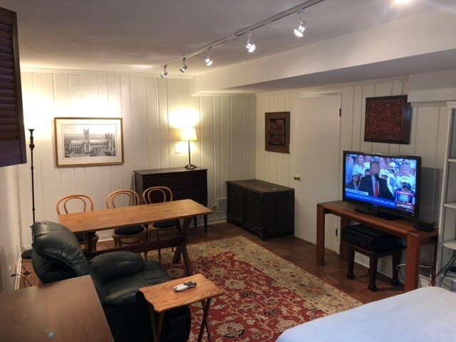 CATHEDRAL HEIGHTS: FURNISHED 1-BEDROOM: Spacious lower-level apartment with separate entrance in private home. Natural light, furnished, wood floors with throw rugs in the bedroom and living room. Fully equipped kitchen, microwave, gas stove. Central heating Bath with shower, large closets, washer/dryer. Shared, large, peaceful garden. Utilities, cable and internet access included. Large flatscreen TV. Great location! Metrobus, great restaurants, Giant, CVS and shops all within two blocks. Short bus ride to Dupont Circle, Cleveland Park and Tenleytown-AU Metro stations. No smoking or pets. Available June 1. $1750 per month. 12 month lease and month to month thereafter. Street parking or Dedicated parking space behind house also available for an additional $175/month.