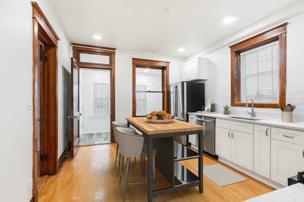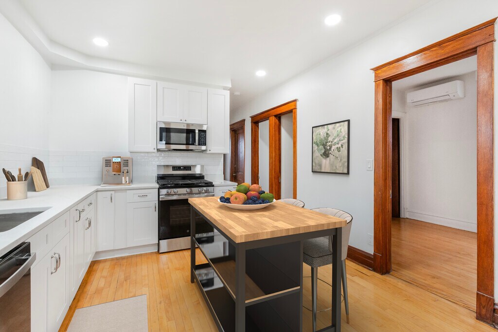 This newly gut-renovated 2-bedroom with a large extra den/office/bedroom, 1-bath unit in the heart of Avondale offers 3rd-floor views of the city skyline. The apartment features a bright and airy living space with entirely new appliances, high-end finishes, new mini-split zone heating/cooling, and originally restored wood trim and floors creating an inviting atmosphere for both relaxation and entertaining. In addition to the bedrooms, the unit boasts a large extra room that can easily be used as a home office, studio, dining room, or recreation space, ideal for working from home or pursuing hobbies. The convenience of in-unit laundry means no more trips to the laundromat, making laundry day simple and hassle-free. Located just a short walk from Milwaukee Avenue, you'll find yourself surrounded by an array of restaurants, cafes, boutiques, and shops, offering a vibrant and dynamic neighborhood lifestyle. With its perfect mix of tranquility and urban convenience, this Avondale gem is a true must-see. Don't miss out on the opportunity to make it your new home! Owner pays for water. Renter pays all other utilities. Renters are in charge of clearing sidewalks in the winter. Instead of deposit, there is a one-time $1150 move-in fee. Lease term will be for at least one year and will terminate on 5/31/27 and open to renewal on a yearly basis from that date.