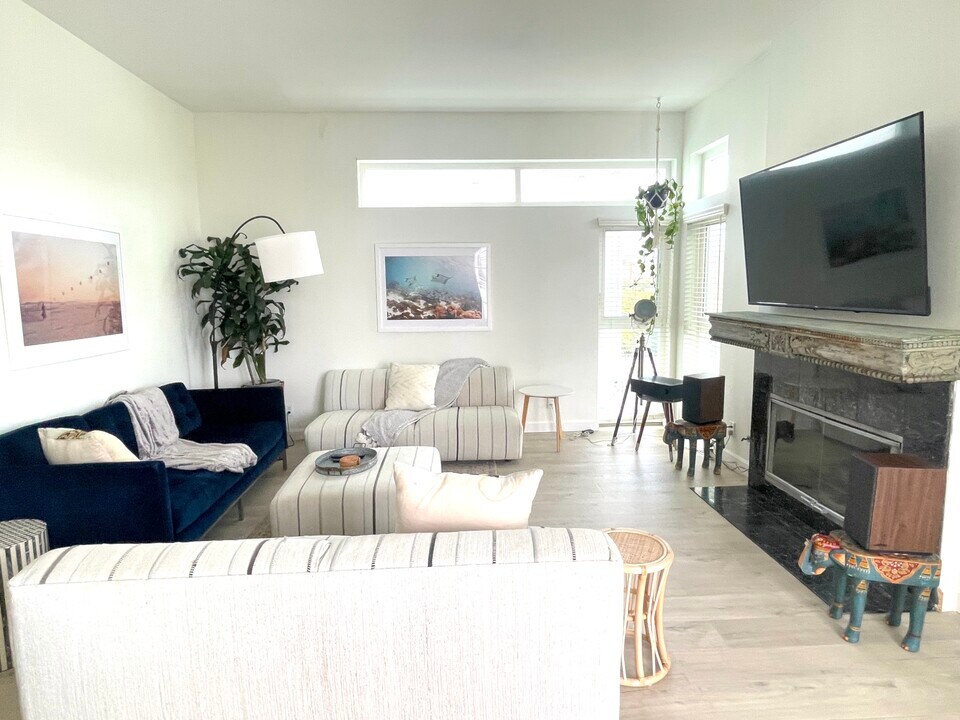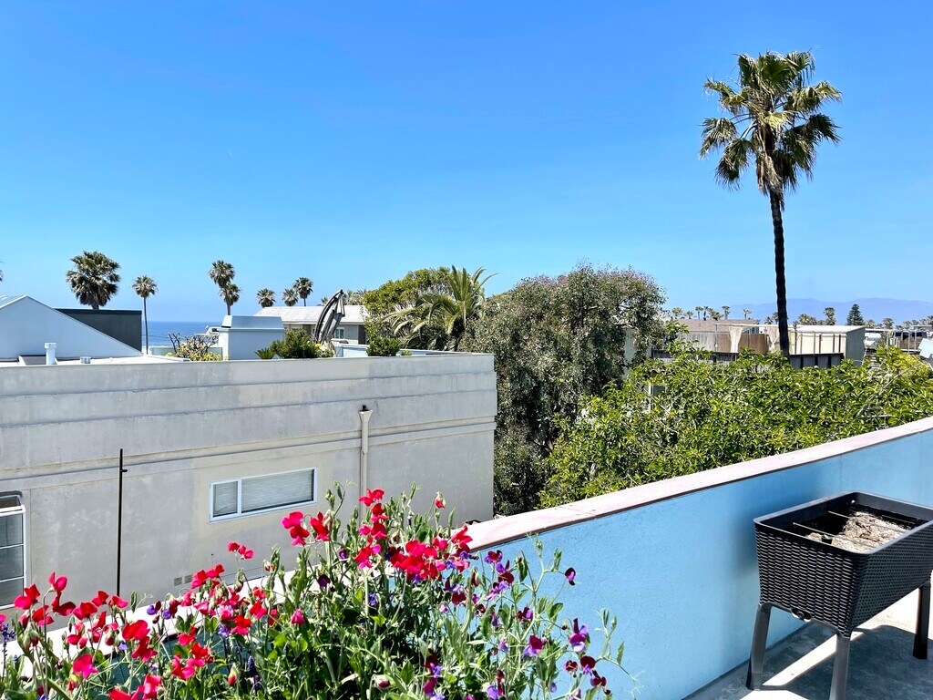 Experience Venice Beach living at its best in this beautifully furnished, three-level townhouse just 100 yards from the sand. Set on one of Venice's storied walk streets, the home sits beside the canals in a quiet pocket while remaining steps from the beach path, Venice Pier, and Washington Street's cafes, restaurants, yoga studios, and shops. The residence features two spacious bedrooms and 2.5 baths, thoughtfully laid out for comfort and privacy. The primary suite includes a king bed, ample closet space, an en-suite bath, and a private balcony. The second bedroom offers a queen bed and a newly renovated bathroom with a modern, curbless walk-in shower. An in-unit laundry room adds everyday convenience. The main living level is bright and open, with a well-appointed kitchen, quality cookware, dining area, and a comfortable living room centered around a decorative fireplace and 65" smart TV. French doors open to a sunlit breakfast patio, bringing in ocean breezes and natural light throughout the day. High-speed Wi-Fi throughout the property as well. At the top, enjoy a private rooftop deck designed for both relaxation and entertaining, featuring lounge seating, a dining table, sun chairs, and a propane grill all with sweeping 360-degree views and coastal air. This is an ideal space for working, unwinding, or hosting friends. The unit is fully private and furnished, with exclusive use of half of the rooftop deck as shown. The building contains only three residences, offering a rare balance of privacy, space, and prime Venice location ideal for medium- or long-term renters seeking a turnkey coastal home.