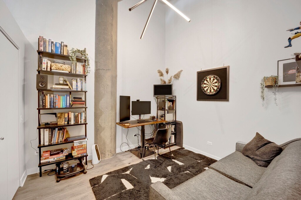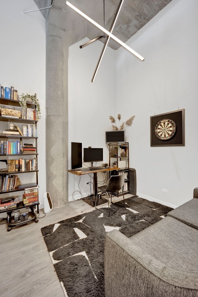 Come see this gorgeously updated 2 bed 2 bath loft in South Loop! Manufactured hardwood floors throughout the entire unit with 16 ft. ceilings giving the unit an open and airy feel with concrete accents, floors, and ceilings. The spacious primary bedroom can easily accommodate a king-sized bed along with a desk or dresser with a walkthrough closet leading to the ensuite bathroom with a separate bath and shower. The second bedroom has a partial lofted wall for additional natural light, perfect for a home office or guest room. The kitchen has all stainless steel appliances with dark finish cabinetry and white stone countertops. Other unit features include an in unit washer and dryer, central AC, private balcony with stunning skyline views, and one garage parking space included in the rental price. Building amenities include a rooftop sundeck and fitness center with secure code access to the building and is located next to a lovely park. Only a 10 minute walk to the nearest train station and less than 20 minute drive to Midway airport!