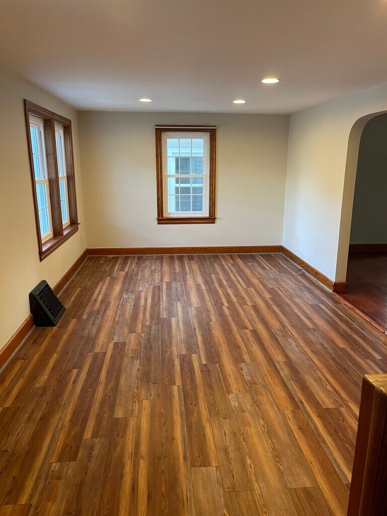 Fully renovated 3 bedroom home in a quiet neighborhood . Beautiful refinished floors and new windows throughout. Modern lighting and new appliances are included . House boasts beautiful wooden doors and window trim There is a welcoming front porch as well as a new back porch that overlooks the generous yard . There is room in the yard to park two cars and fir ample play space . No smoking or pets , allowed . Come take a tour and find your next home .