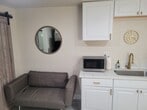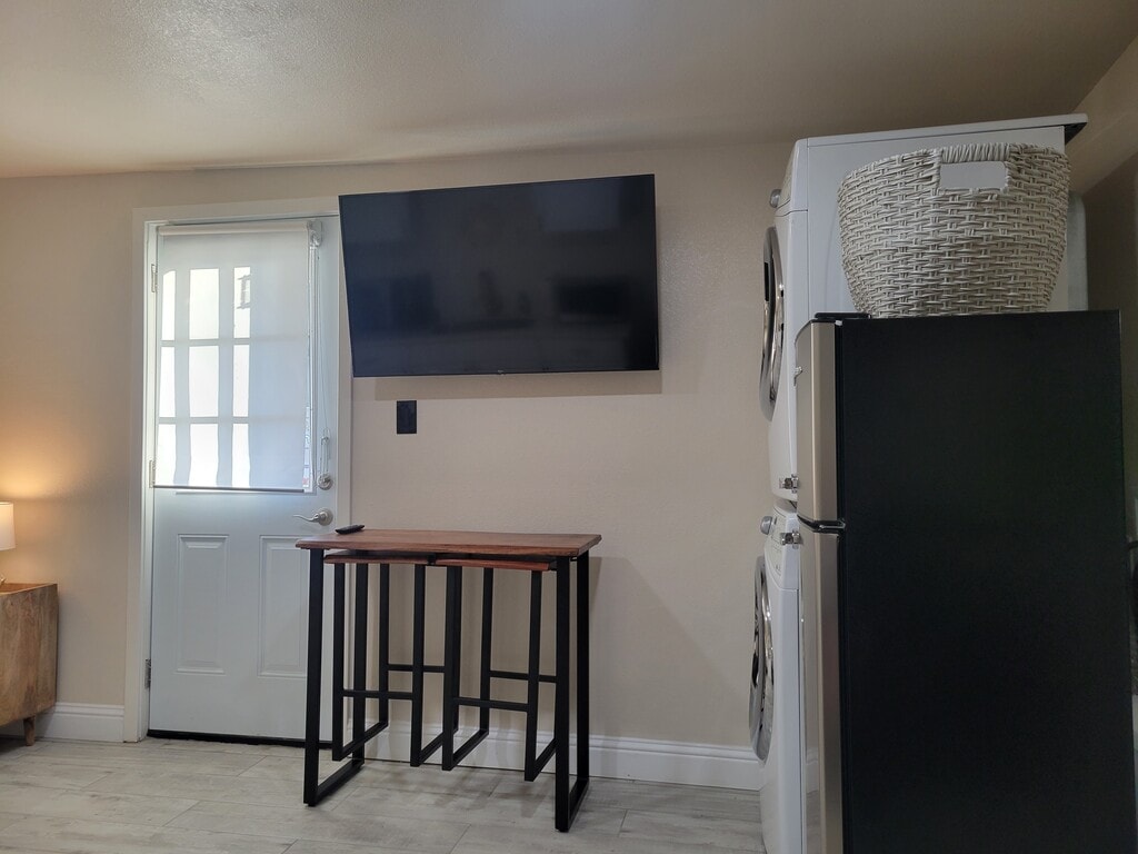 We converted our detached garage into a studio. It comes fully furnished with a comfortable queen size bed, a 50" TV, Full size washer and dryer, the kitchenet has: a 2 burner hot plate, Keurig coffee, a stove top oven/air fryer, all plates, kitchen utensils, microwave, fridge, and mini split (air conditioner and heater). Utilities will be a $100 flat rate; this includes: MID, sewer, garbage, water, and 150MBPS Wifi. All you need to do is just bring your clothes and move in.