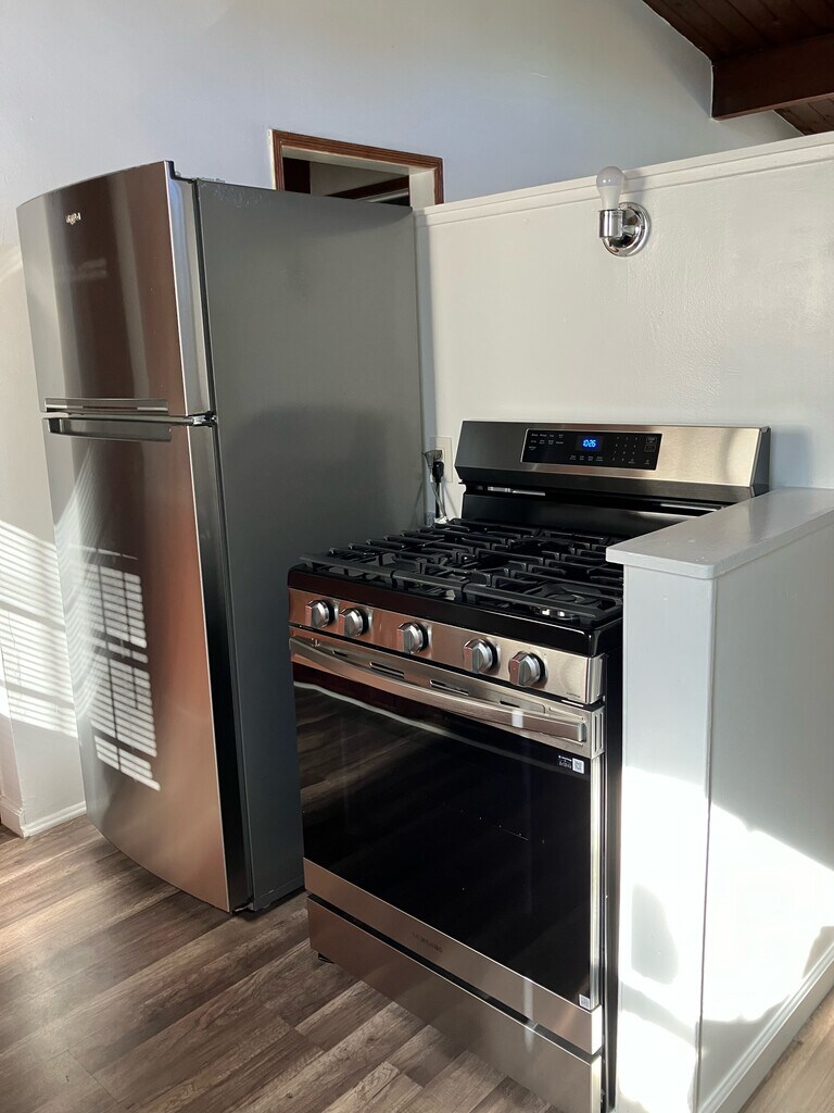 1 Bedroom, 1 Bath Apartment. Freshly painted New Stainless Steel Stove and Refrigerator Laminate Wood Flooring Stackable Washer/Dryer hook-ups Private side yard 1 assigned covered parking space Many amenities close by No pets Tenant pays Gas, Electricity and proportional share of the Water and Trash. Quiet neighborhood and City of Los Angeles, is just 10 miles away, and other major destinations are freeway close. Month to Month, renter pays for gas, electri proportional share of water and trash. No pets.