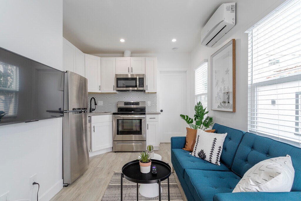 Welcome to 329 N. Alexandria Ave, Los Angeles, CA 90004 - a charming and unique micro bungalow house offering the perfect balance of privacy and convenience in the heart of Los Angeles. This 2-bedroom, 2-bathroom home is situated in a highly sought-after location and boasts an efficient layout, making the most of its 425 square feet of living space. This house is 1 individual house that is part of 8 bungalows. As you step into this lovely abode, you'll find a cozy yet functional combined living and kitchen area. The kitchen comes equipped with modern amenities such as an induction stove, refrigerator, microwave, and dishwasher. The open-concept living space allows for seamless entertaining and relaxation, making it feel like a true retreat. All rooms have air conditioning and heat from the mini-split A/C system. Both bedrooms feature en-suite master bathrooms, ensuring comfort and privacy for all occupants. The apartment can come fully furnished, including 2 queen memory foam beds, a smart TV, and comfortable indoor and outdoor couch sets. With no shared walls, this detached bungalow offers the peace and quiet of a standalone home. Your furry friends are welcome, too, as this unit is pet-friendly! The front yard space, complete with outdoor furniture, provides a perfect spot for pets and tenants alike to unwind and enjoy the beautiful Southern California weather. As tenants, pay for electricity, gas, and trash, while the owners cover water and gardening expenses. With a washer and dryer in the unit, you'll enjoy the convenience of doing laundry from the comfort of your own home. Discover the charm of this well-designed micro bungalow located at 329 N. Alexandria Ave. Experience a unique blend of privacy and modern amenities, all within close proximity to the best that Los Angeles has to offer. Don't miss the opportunity to make this inviting space your very own home. Contact us today to schedule a viewing! This micro spanish style bungalow is in a quiet area of north Koreatown and hillside with city views of downtown. Street parking only. Furniture rental $25/month. Pet rent $50/month/pet. 6 month to 1 year lease available.